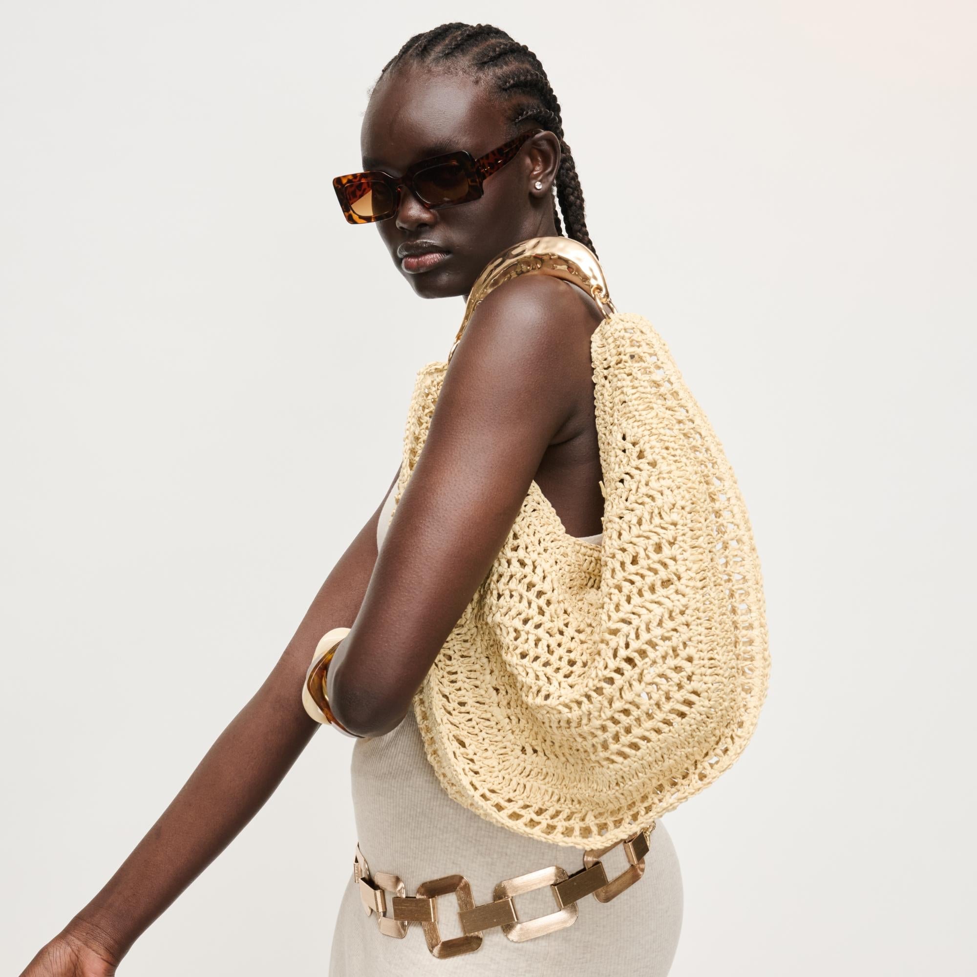 Slouchy woven silhouette topped with a sculptural hammered top handle. Open-weave body, roomy lined interior, lightweight slouch for effortless shoulder or hand carry. Statement metal arch handle, subtle hardware, versatile day-to-night styling.