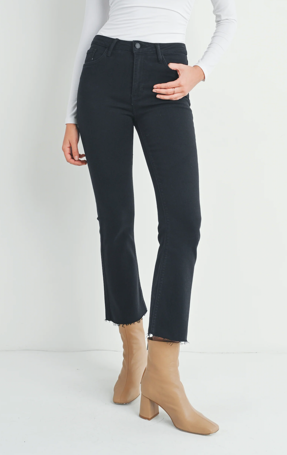 Slim from the hips to thighs with a gently flared leg and perfectly cropped to show off a chic pair of shoes. With just enough stretch for all-day comfort, this high rise jean will be a go-to.