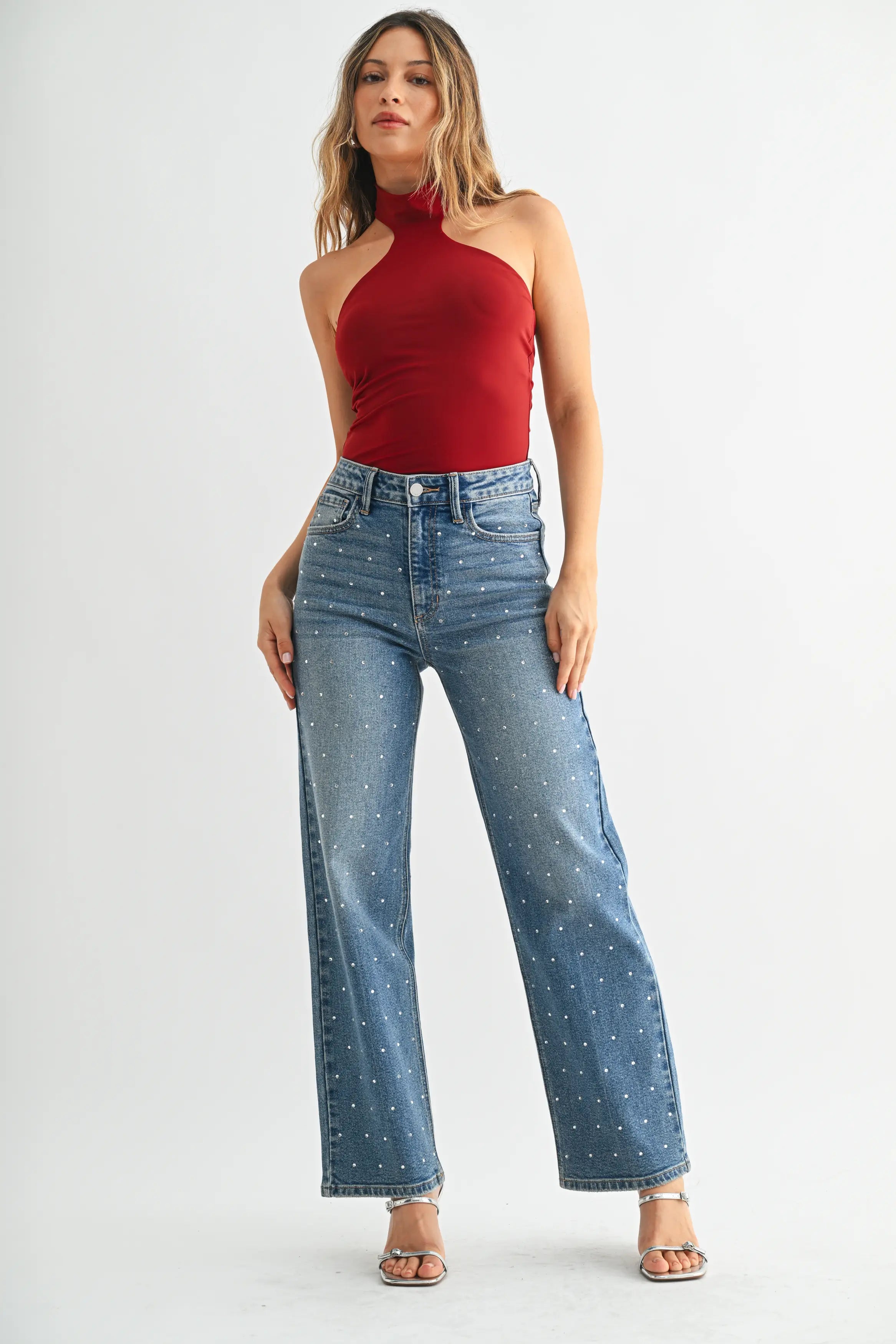 Turn heads in these rhinestone-studded straight-leg jeans — the ultimate mix of classic denim and subtle sparkle. Featuring a flattering high-rise waist and relaxed leg, these jeans bring a touch of glam to everyday style. Pair them with a fitted tank or cozy sweater for an effortless day-to-night look.