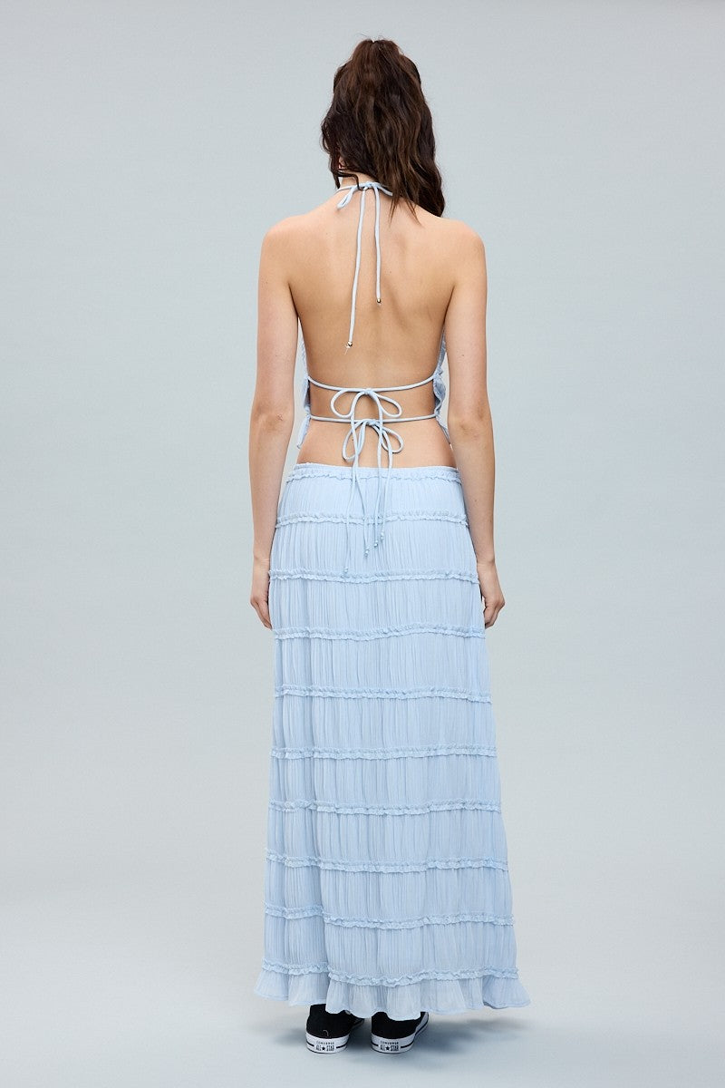 Lightweight and effortlessly feminine, this two-piece set features a halter-style crop top paired with a flowy tiered maxi skirt. Designed with delicate ruffle detailing and soft pleating throughout, it creates beautiful movement with every step. The elasticized fit and adjustable waist tie make it as comfortable as it is flattering—perfect for warm days, vacations, or casual events.