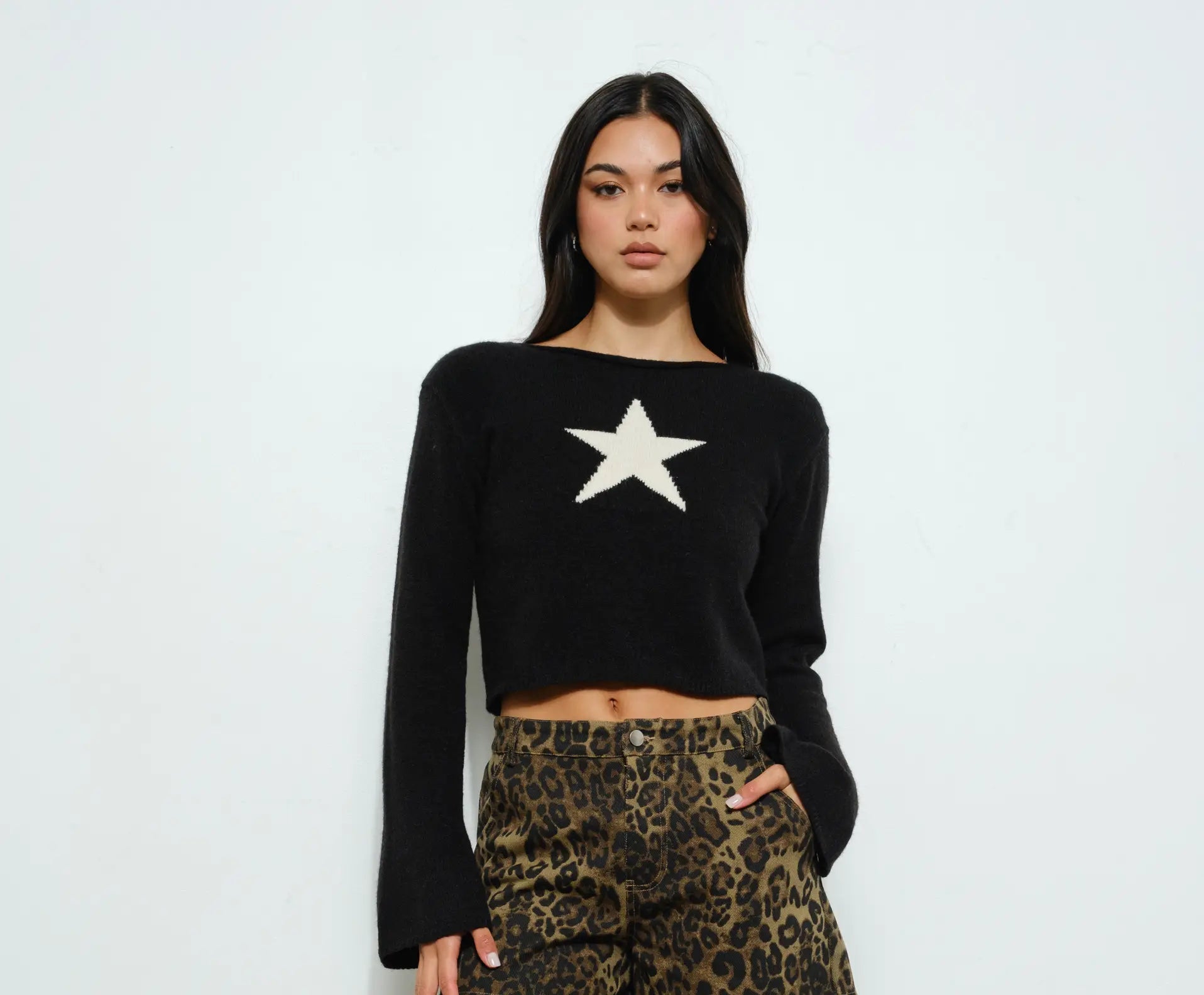 An easy statement piece you’ll wear on repeat. This cropped star sweater features a bold contrast star detail and a relaxed silhouette that feels effortless and cool. The wide neckline and elongated sleeves give it that perfectly undone look, while the lightweight knit makes it ideal for layering year-round.