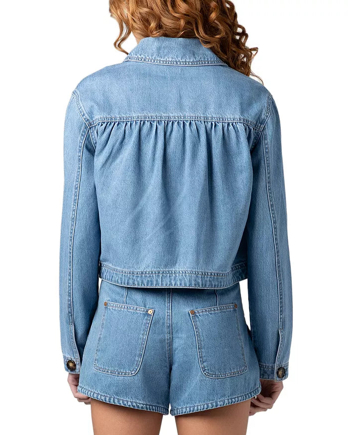 Your go-to layer, reimagined. This cropped denim jacket features a relaxed fit with structured details and statement buttons for an easy, elevated feel. Perfect for throwing over anything—from dresses to matching denim.