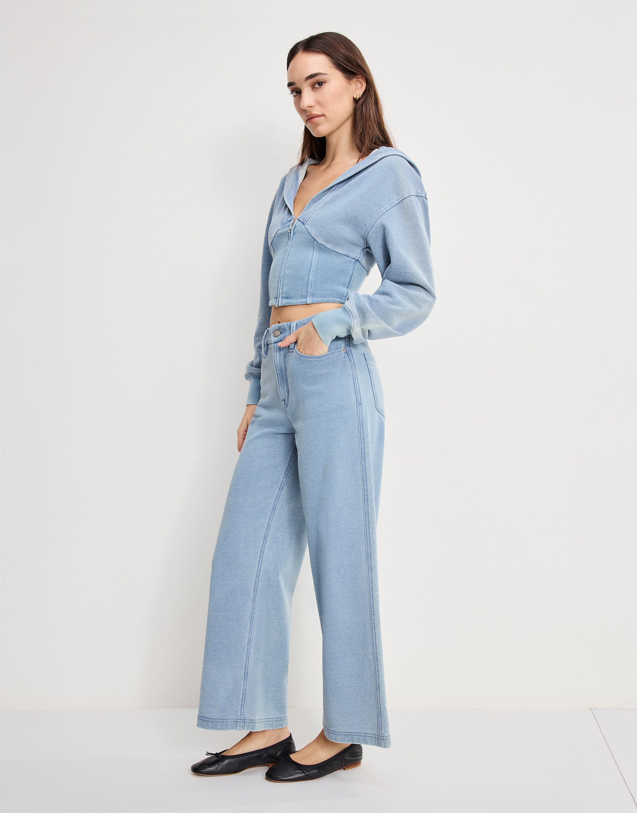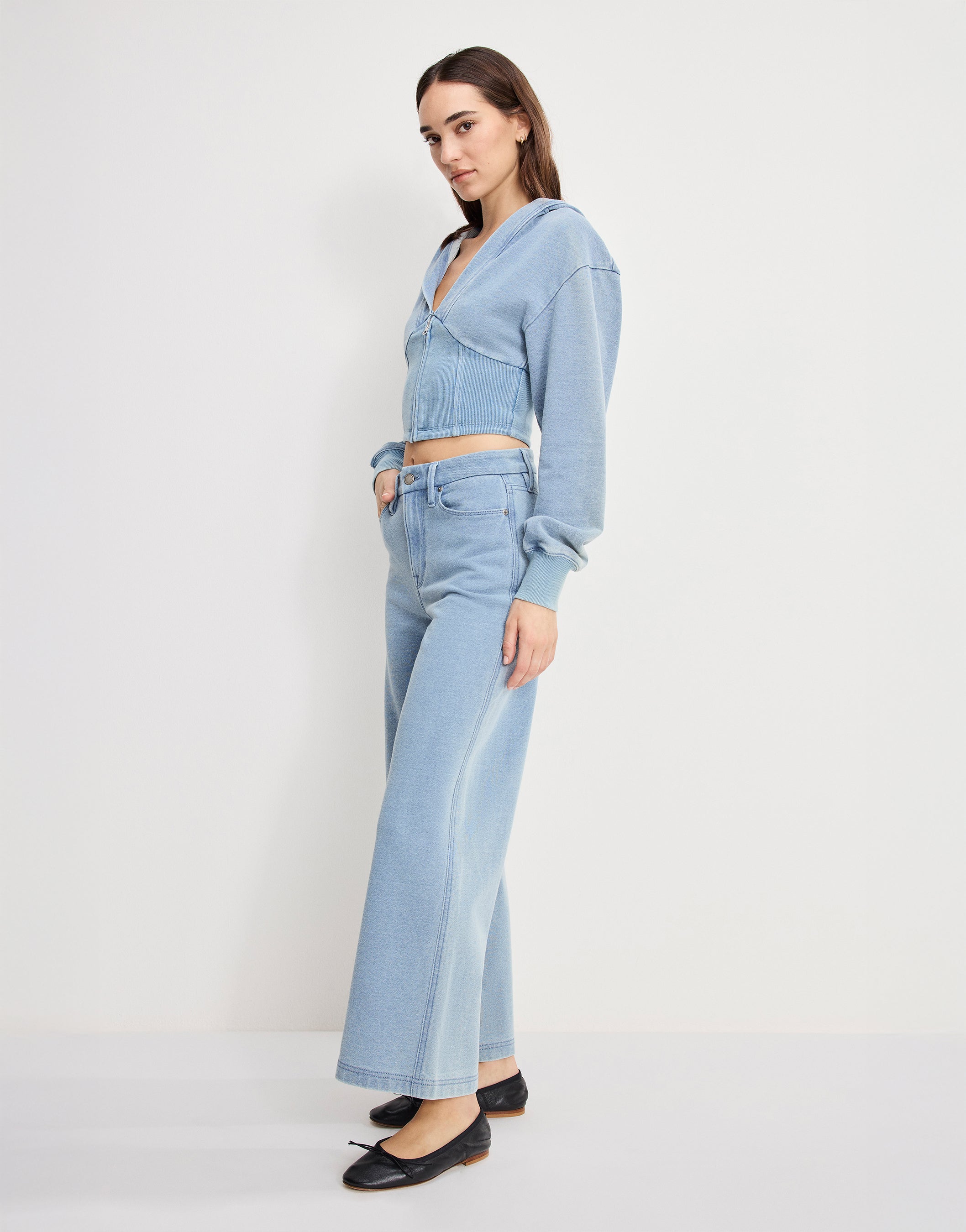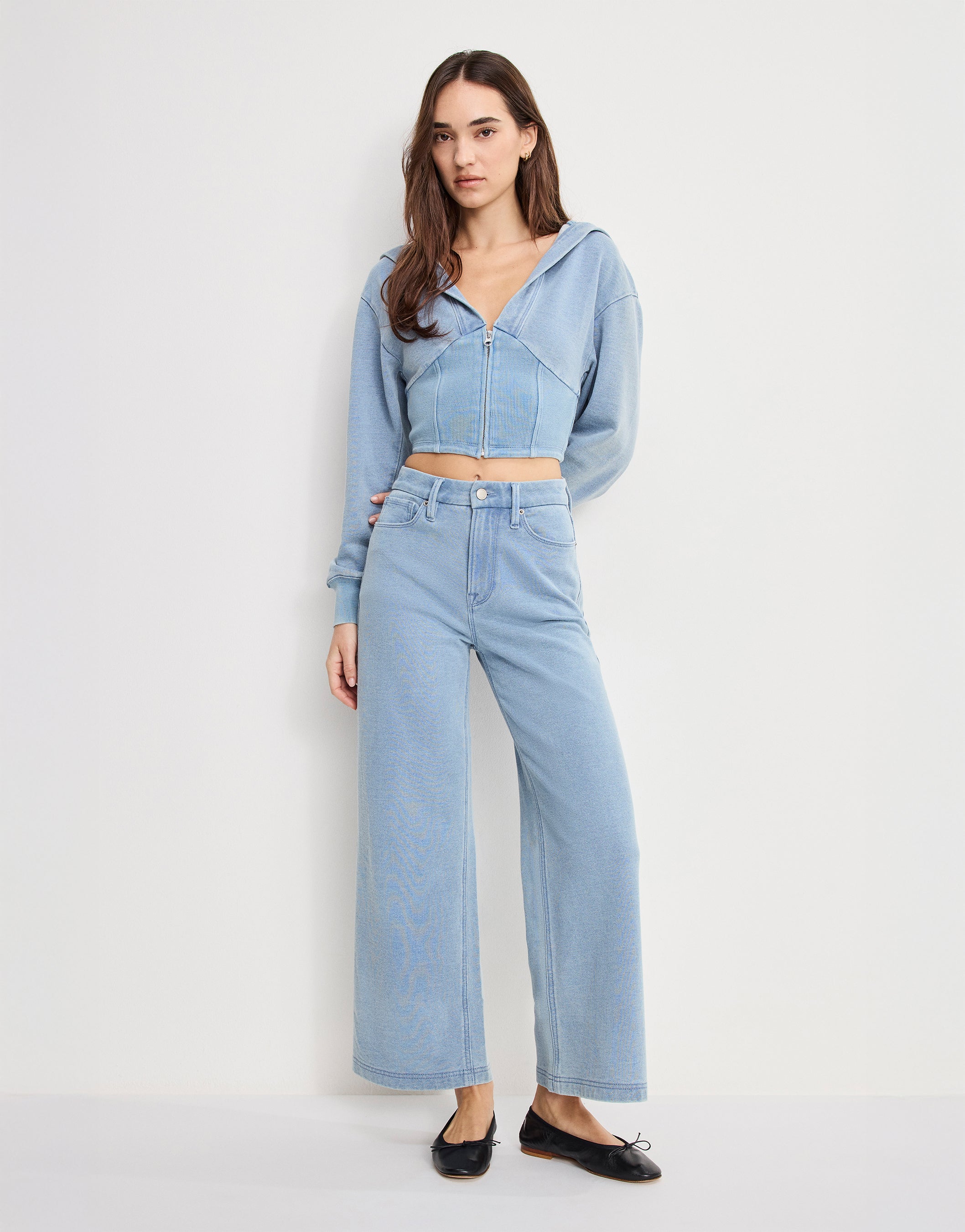 The comfort of loungewear with the look of denim. These high-rise wide-leg pants are made from a soft, flexible knit that gives you all-day comfort without sacrificing style. The relaxed leg and cropped length make them easy to dress up or down — polished enough to wear out, comfortable enough to live in.