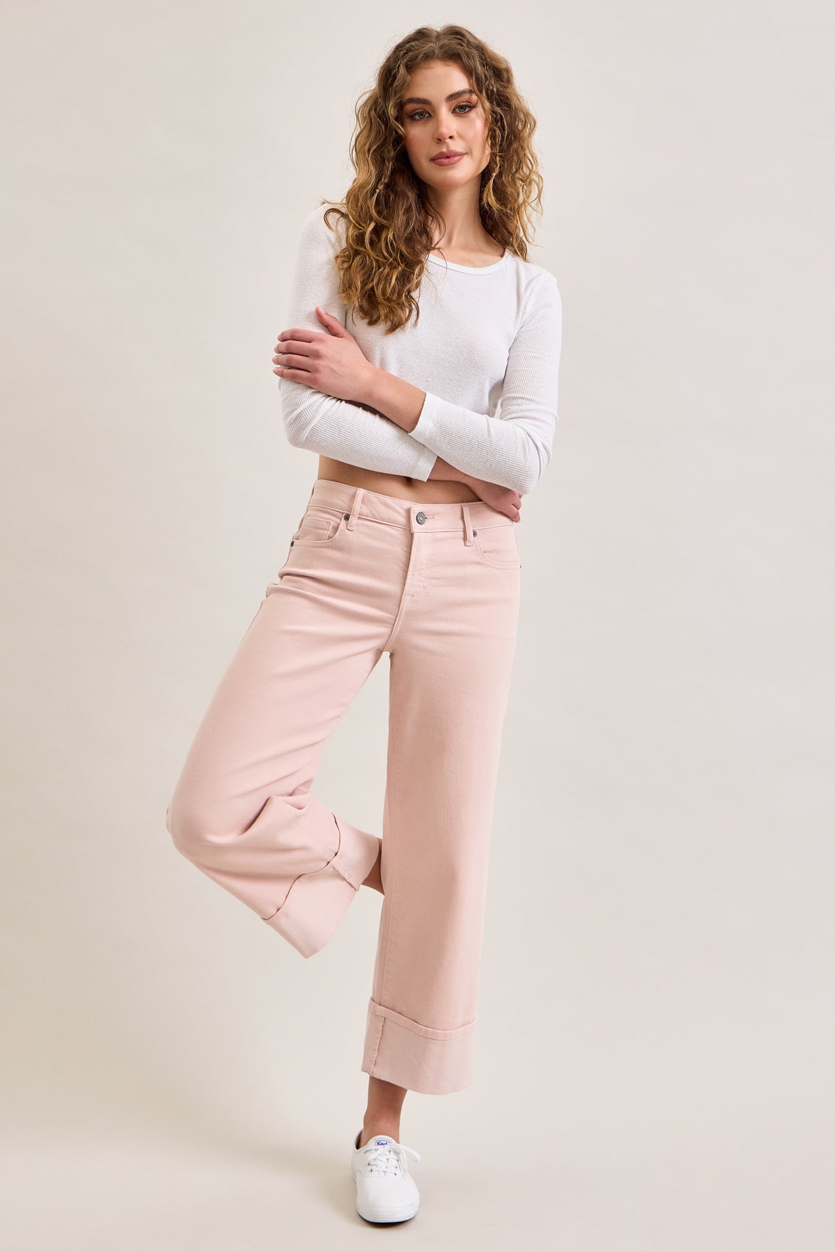 A modern take on everyday denim, these cropped jeans feature a relaxed straight leg with a clean, structured fit. Designed with a mid-rise waist and finished with a bold cuffed hem, they offer an effortlessly cool silhouette that pairs perfectly with everything from fitted knits to casual tees. Front Rise 9 1/2", Inseam 26" (Cuffed)