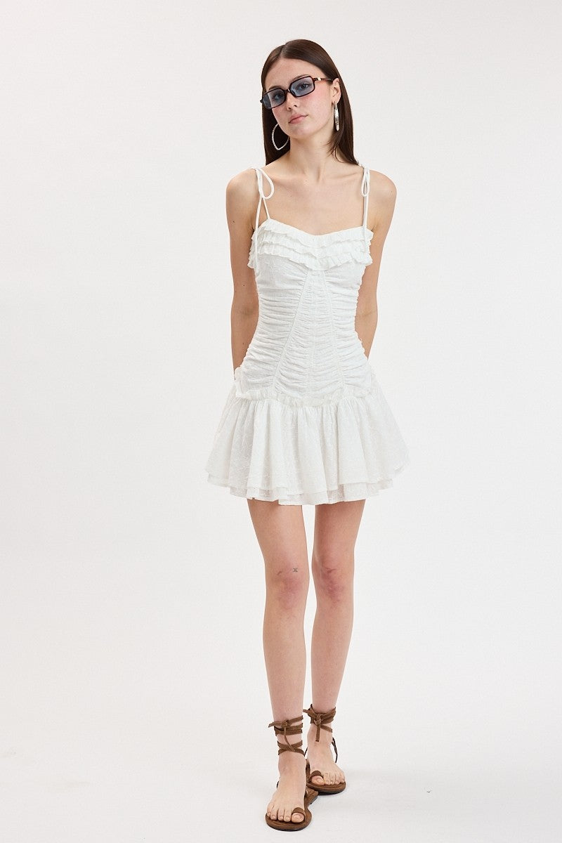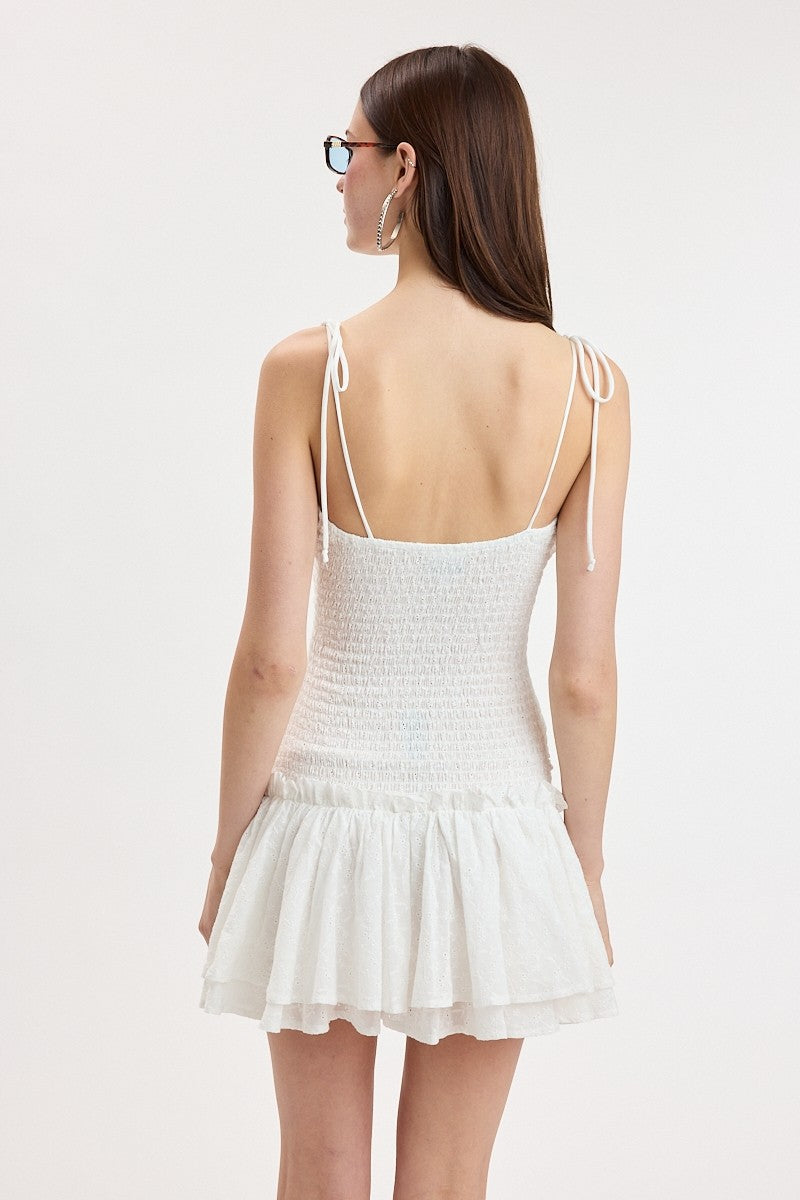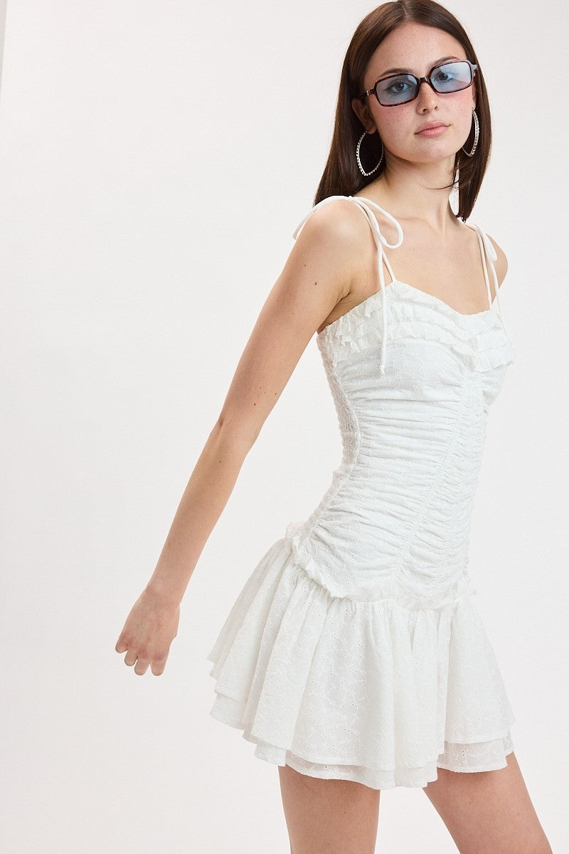Eyelet Tie Strap Tiered Ruffle Mini Dress