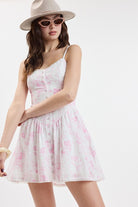Sweet and feminine, this mini dress features a fitted button-front bodice with delicate trim details and a softly flared skirt for a flattering, easy silhouette. Designed with thin straps and subtle detailing throughout, it’s the perfect throw-on-and-go piece for sunny days and weekend plans.