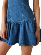A modern take on a classic, this denim mini dress features a fitted bodice with structured seaming and a flouncy drop-waist skirt for a playful, flattering silhouette. Easy to style and effortlessly cool, it’s perfect for everyday wear or dressed up for a night out.