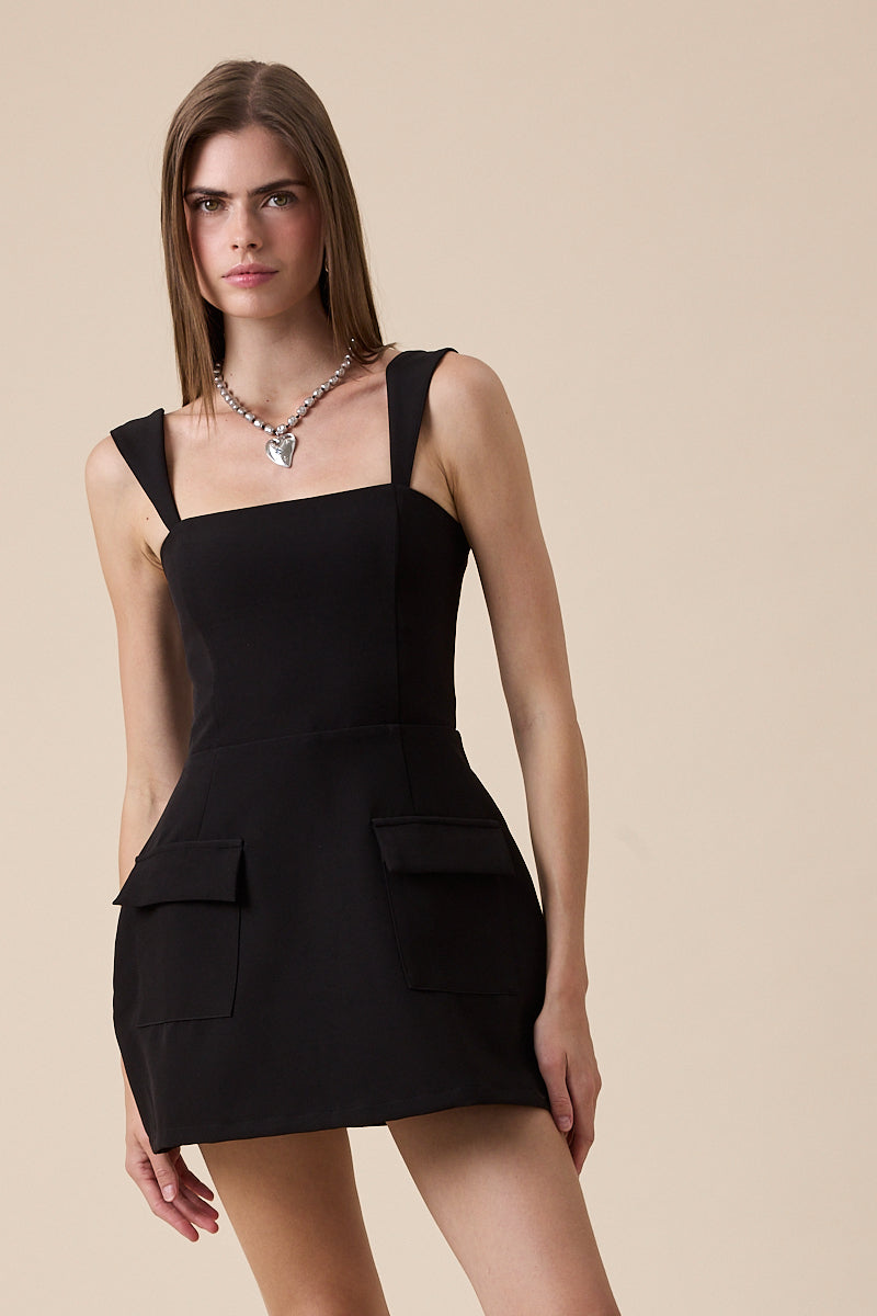 Sleek, chic, and effortlessly flattering, this little black dress is a modern must-have. Designed with a square neckline and wide straps, it creates clean lines that highlight your shoulders and collarbone. The fitted bodice flows into a tailored mini skirt, complete with statement flap pockets for a fresh, structured touch.