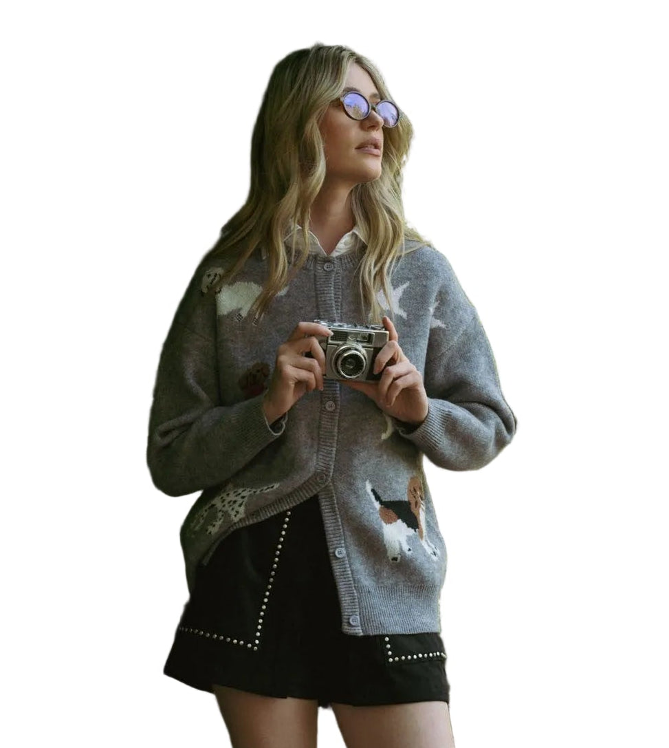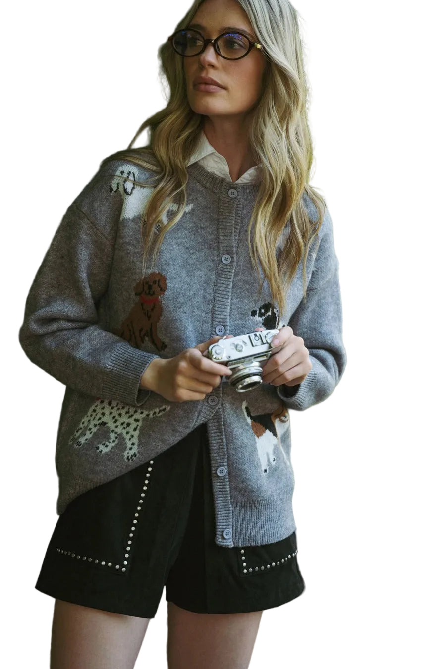 Cozy with a sense of humor. This soft knit cardigan features playful dog and star motifs for a fun, standout look that still feels effortlessly wearable. Designed with a classic button-front silhouette and relaxed fit, it’s the kind of cardigan that sparks compliments the second you put it on. Equal parts cozy, quirky, and cool.