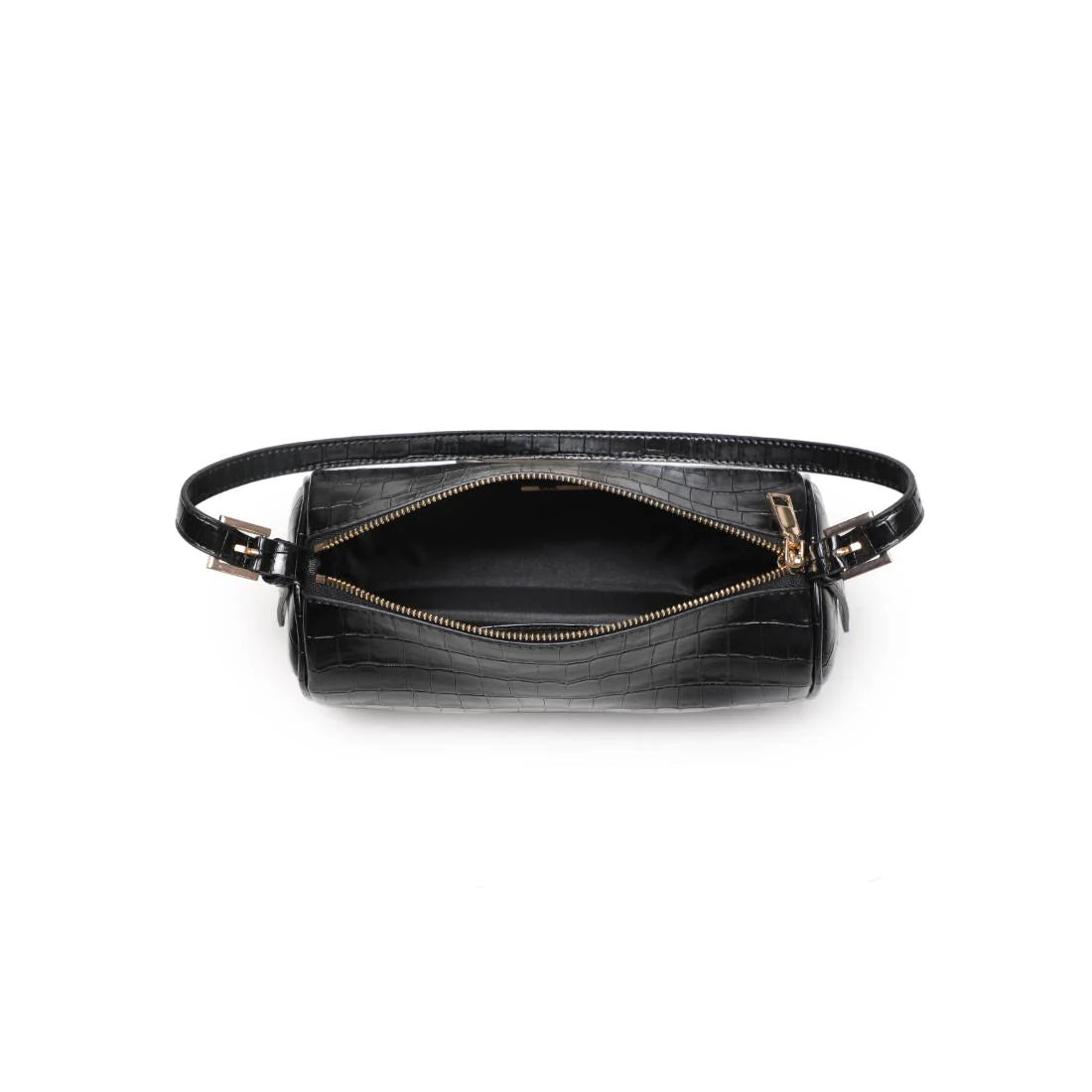 • Exterior Details: Gold Hardware, Croc Print, Adjustable Shoulder Strap, Cylinder Shape