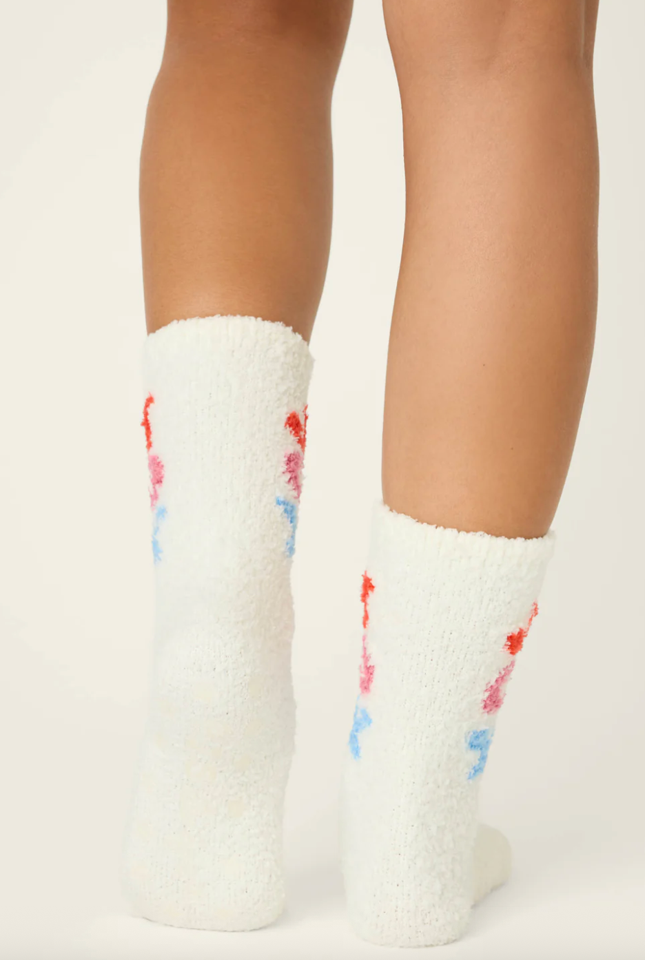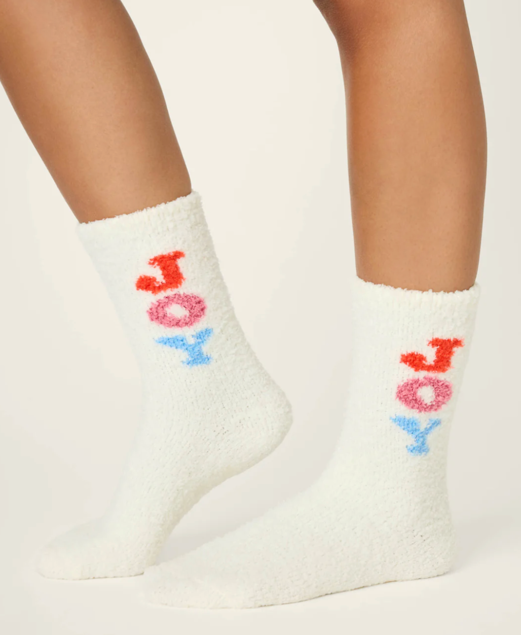 Snuggle into the holiday season with these ivory fuzzy socks, finished with bold “Joy” lettering in red, pink, and blue across the cuff. With gripper bottoms, they’re a cheerful pair made for cozy lounging, holiday gifting, and festive mornings