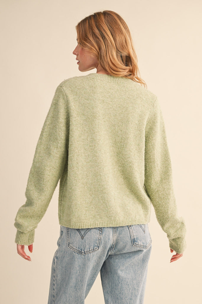 Cozy, classic, and effortlessly pretty. This soft button-front cardigan has that perfect relaxed fit with a slightly fuzzy texture that feels like a warm hug. The simple crew neckline and clean button detailing make it an easy staple — wear it on its own, layered over a tank, or tossed over your shoulder for that cool-girl vibe.