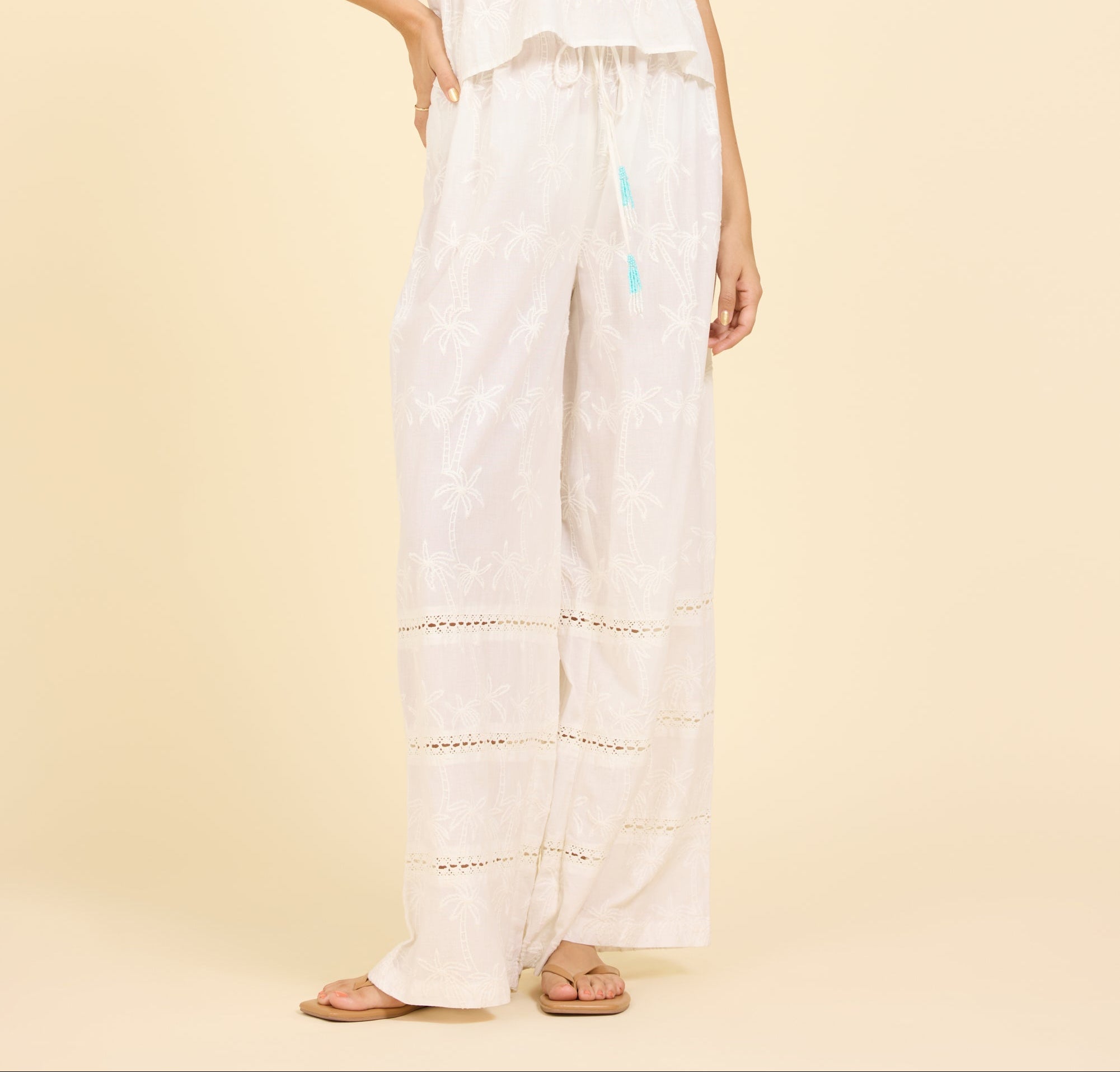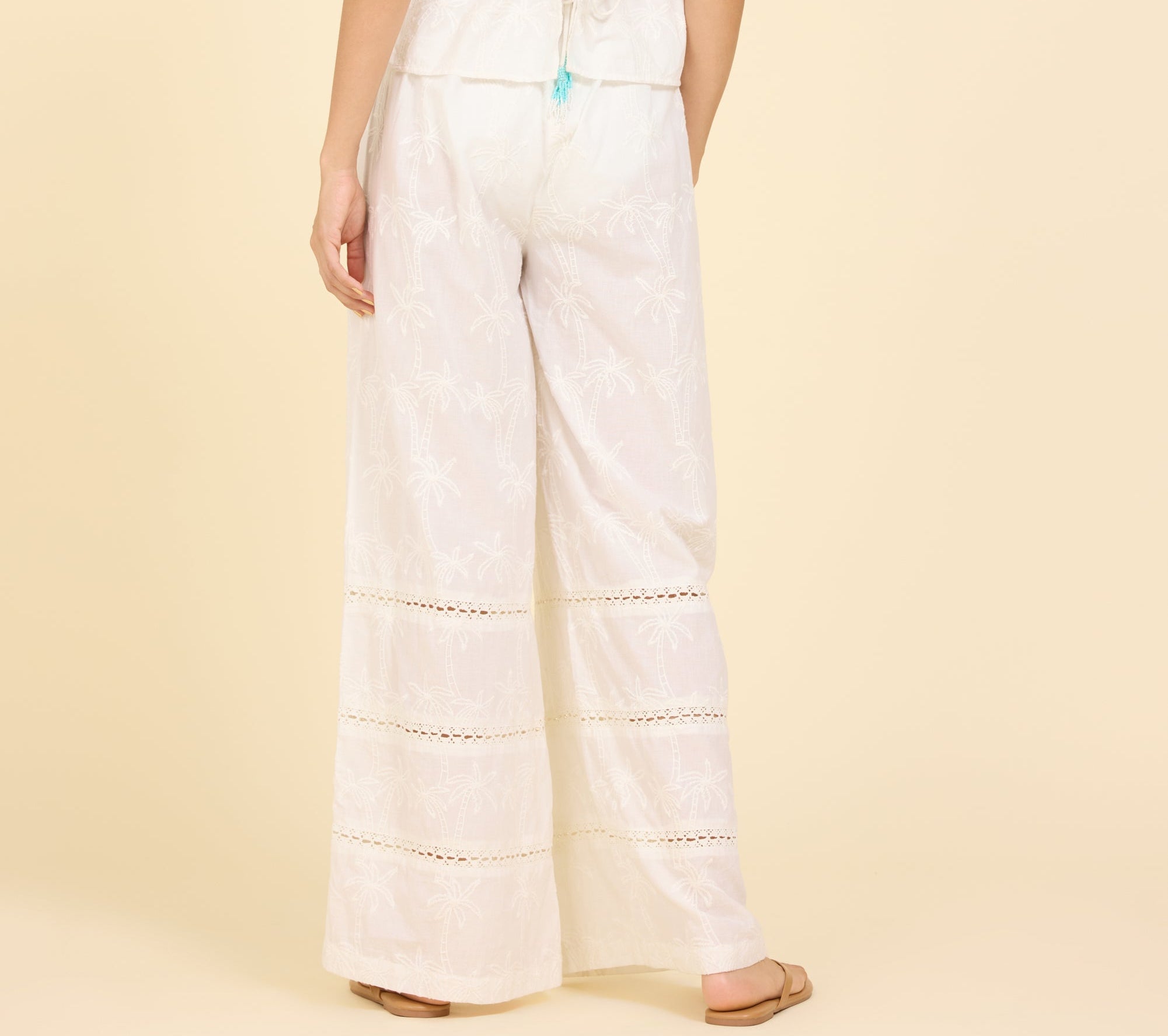 These wide-leg pants are designed for effortless comfort with a relaxed, breezy feel. Featuring a soft elastic waistband with an adjustable drawstring, they flow beautifully with every step. Subtle embroidered detailing adds texture and interest, making this an easy choice for warm-weather days, vacations, or laid-back styling.