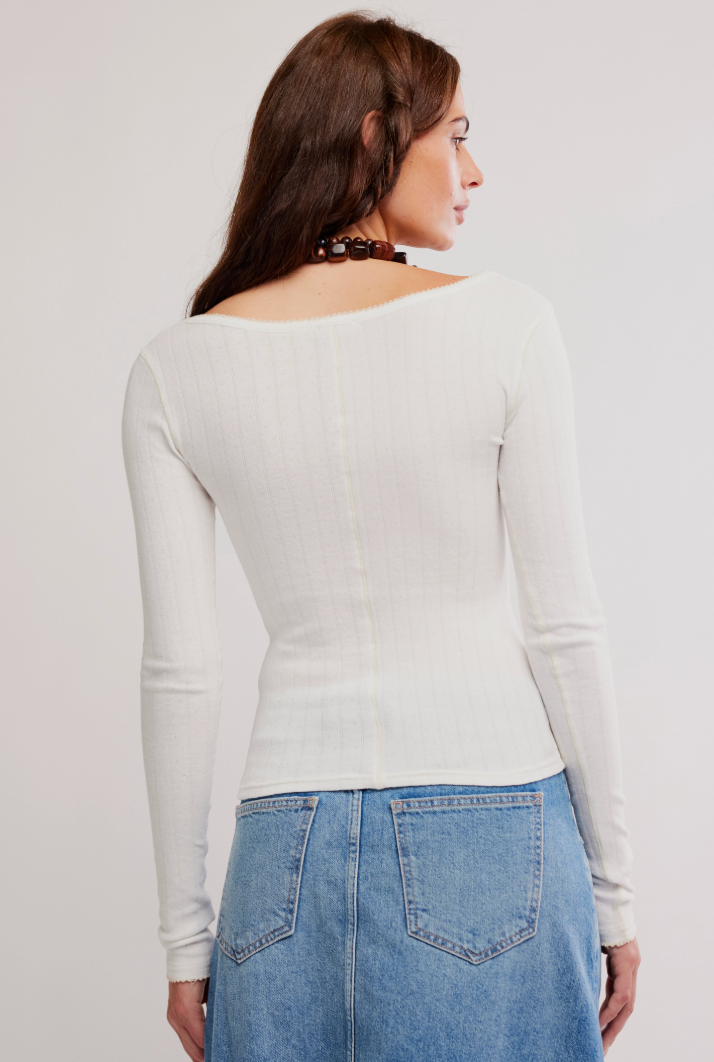This effortlessly flattering ribbed top is the kind of piece you’ll reach for on repeat. Designed with a feminine scoop neckline and delicate button front, it hugs in all the right places while still feeling easy and wearable. The slim fit and subtle stretch make it perfect for layering or wearing solo with your favorite denim.