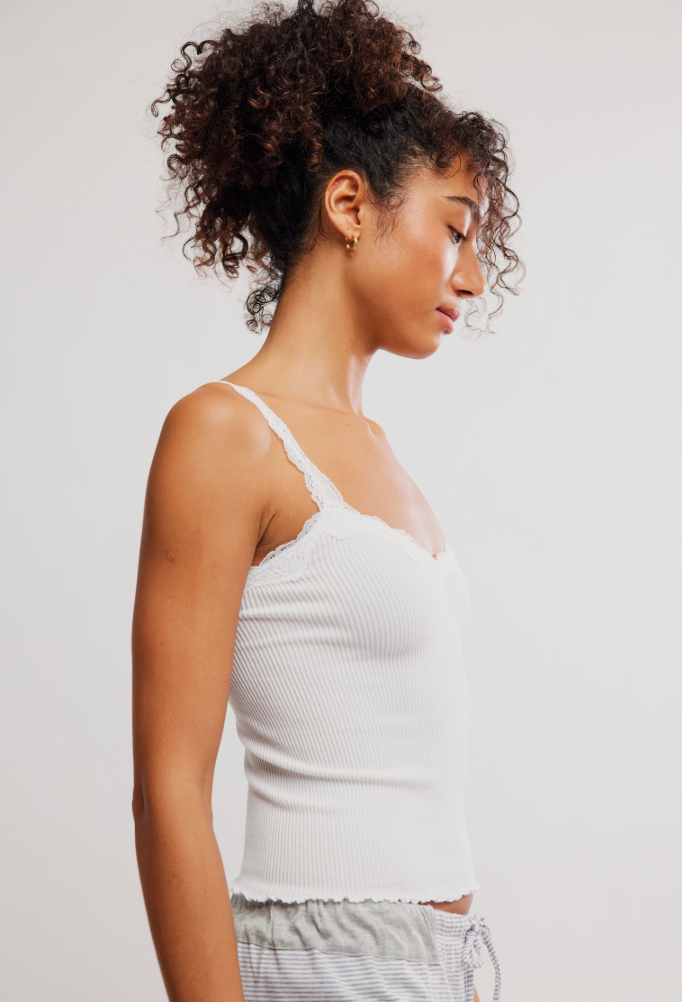 This lace-trim ribbed tank is the perfect mix of sweet and sultry. Designed with delicate lace straps and a flattering scalloped neckline, it hugs the body just right while still feeling soft and comfortable. Wear it layered under a blazer or cardigan, or style it solo for a pretty, feminine moment.