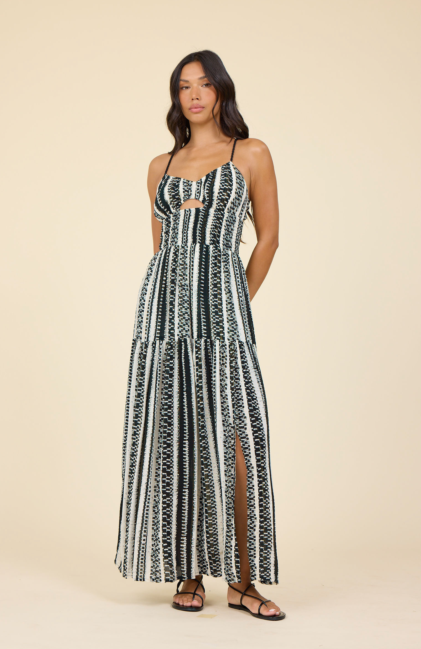 This maxi dress is designed for effortless warm-weather style. Featuring a flattering fitted bodice, delicate straps, subtle cutout detail, and a flowy skirt with easy movement, it creates a polished yet relaxed silhouette. Perfect for vacations, weekends, or casual events, it’s an easy statement piece you’ll reach for all season long.