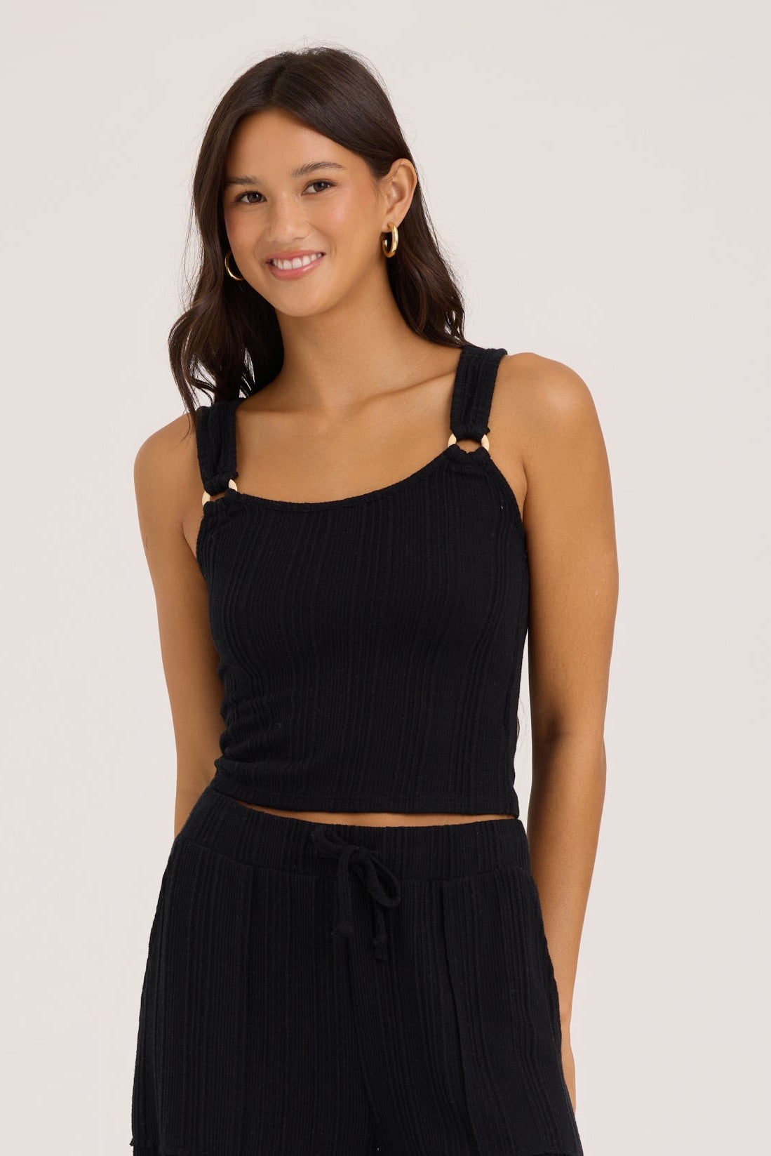 An elevated everyday tank in a soft ribbed knit. This black cropped style features wide straps with subtle gold ring accents for a modern touch. Easy to wear on its own or paired with the matching pants for a polished lounge look.