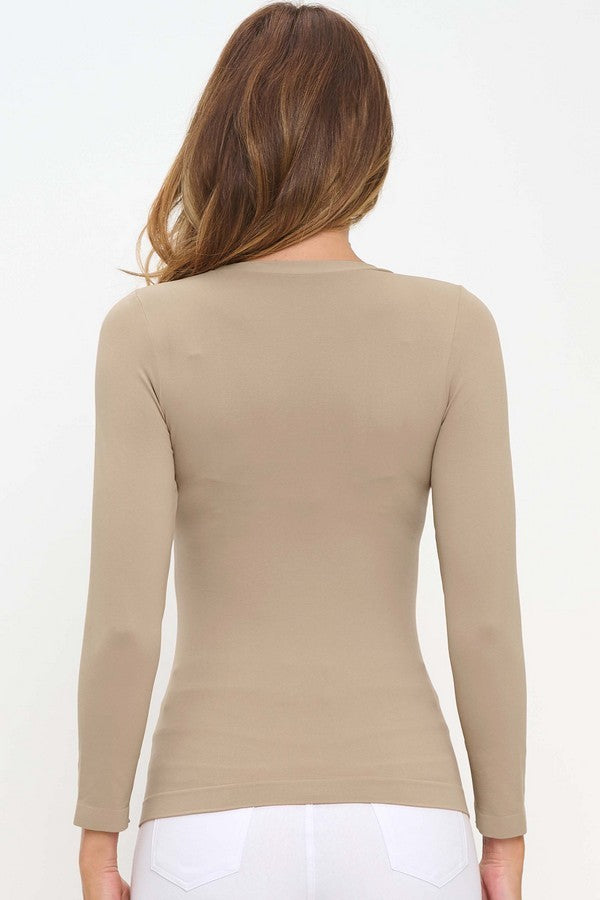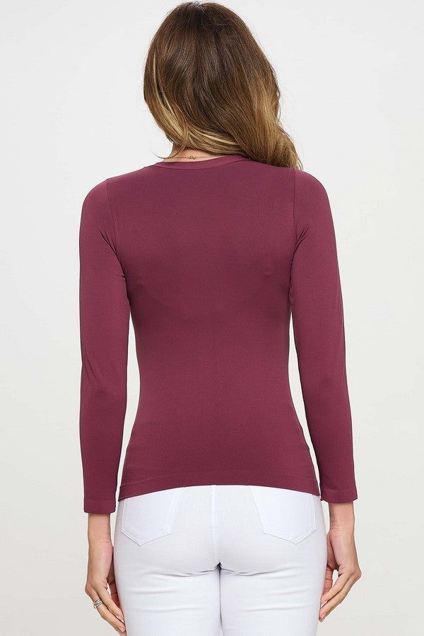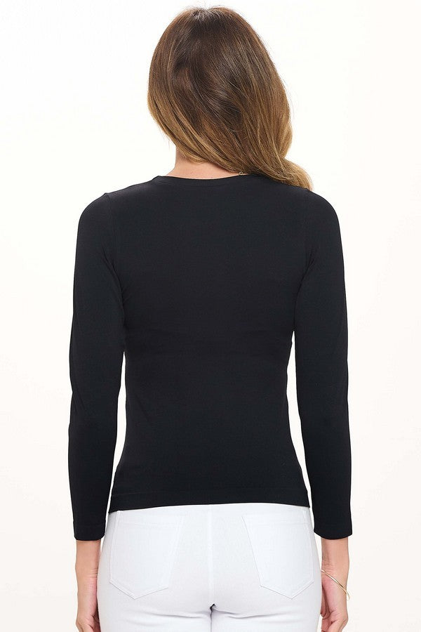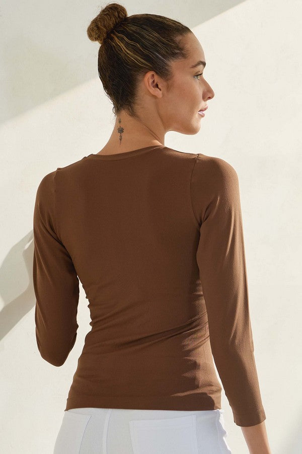 A sleek, second-skin fit that’s made to move with you. This long sleeve top features a smooth, stretchy finish that flatters your shape while keeping things minimal and polished. Perfect on its own or layered under blazers, knits, or denim—your new go-to base layer for every season.