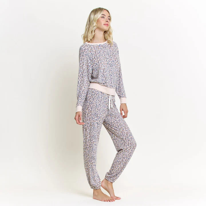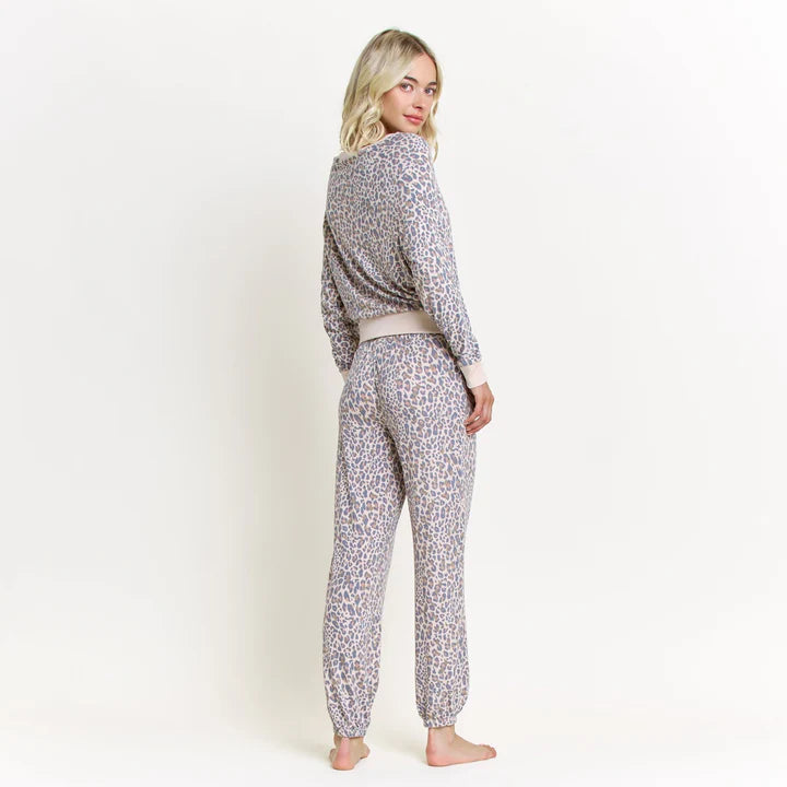 Effortlessly cozy with a touch of edge, this leopard lounge set is your go-to for relaxed days and laid-back nights. Featuring a soft long-sleeve pullover and matching jogger-style pants, the muted leopard print keeps it chic while the comfy stretch fabric makes it perfect for lounging, travel, or casual everyday wear. Finished with ribbed trim and an adjustable drawstring waist, this set is made for comfort without sacrificing style.