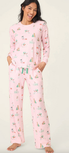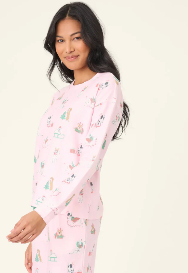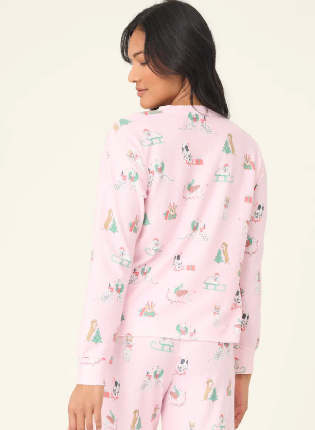 Cozy season just got cuter. This soft ribbed long-sleeve top features the sweetest holiday dog print—complete with pups in scarves, sleighs, wreaths, and festive little details all over a blush-pink backdrop. The relaxed fit and lightweight stretch make it perfect for lounging, gifting, or pairing with the matching shorts or pants for the full pajama look.