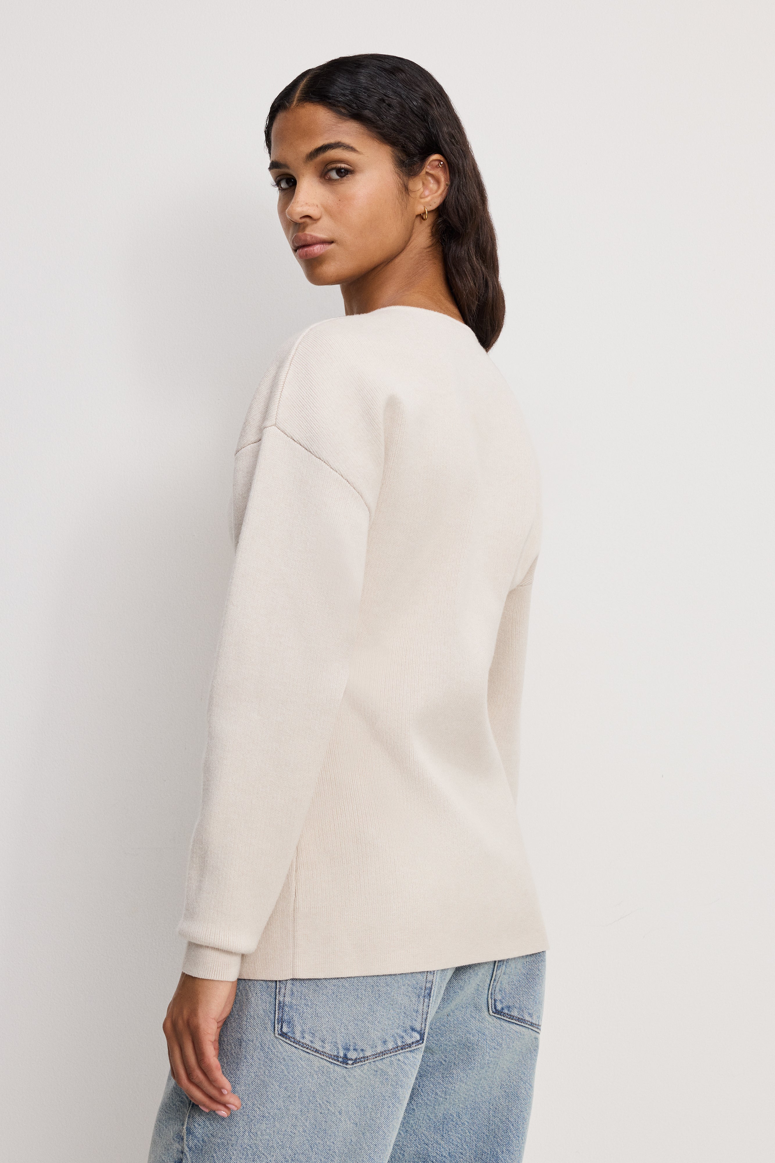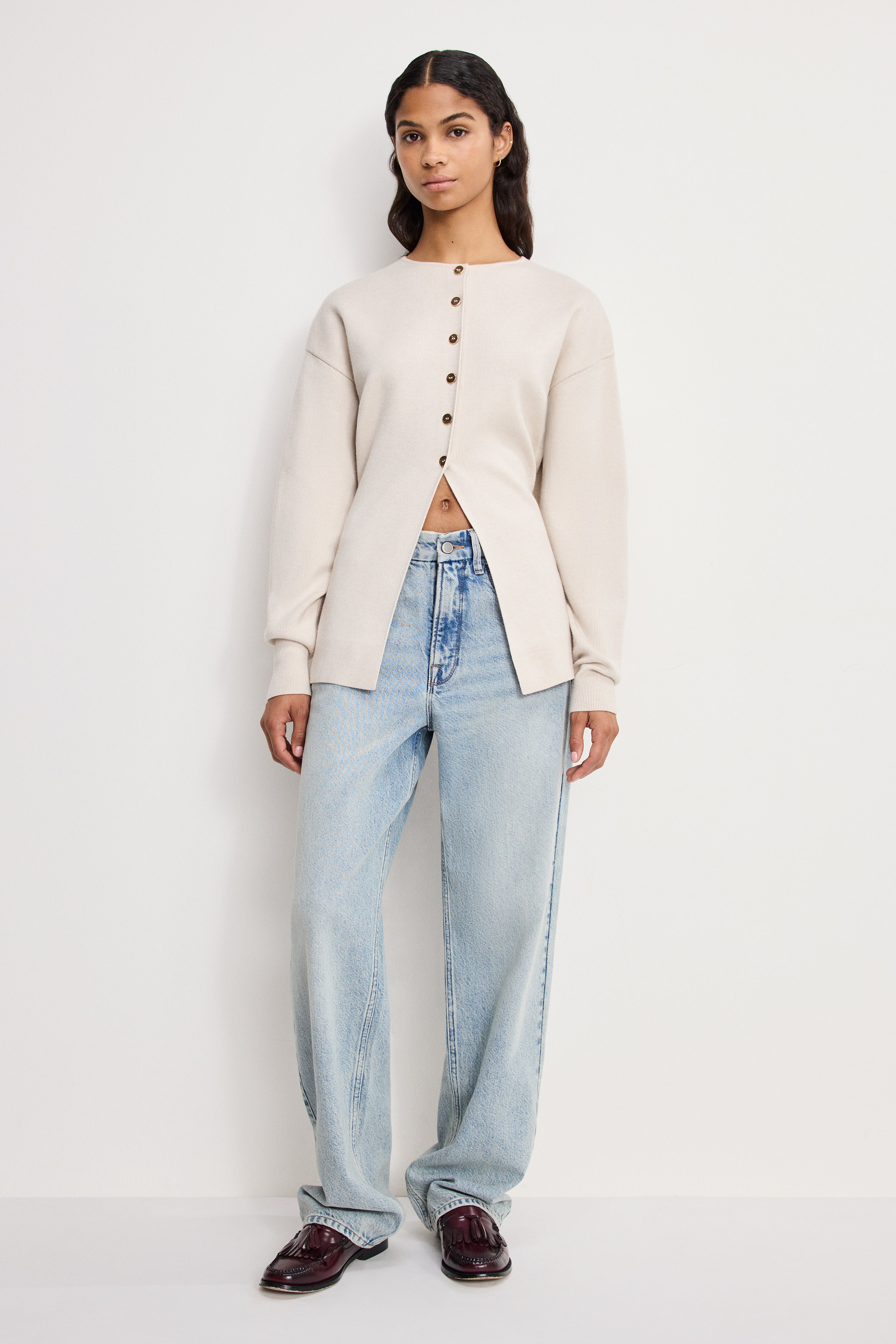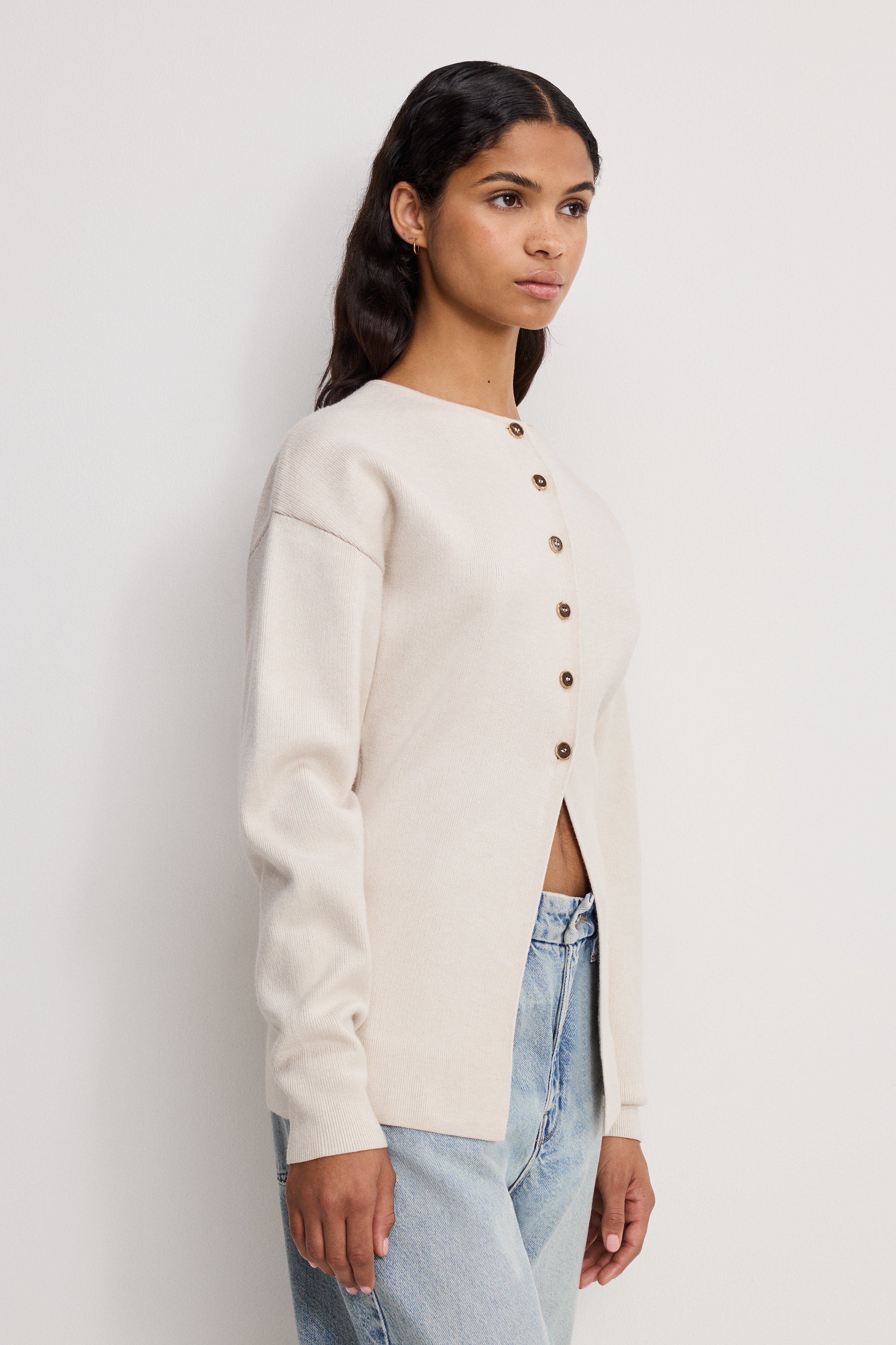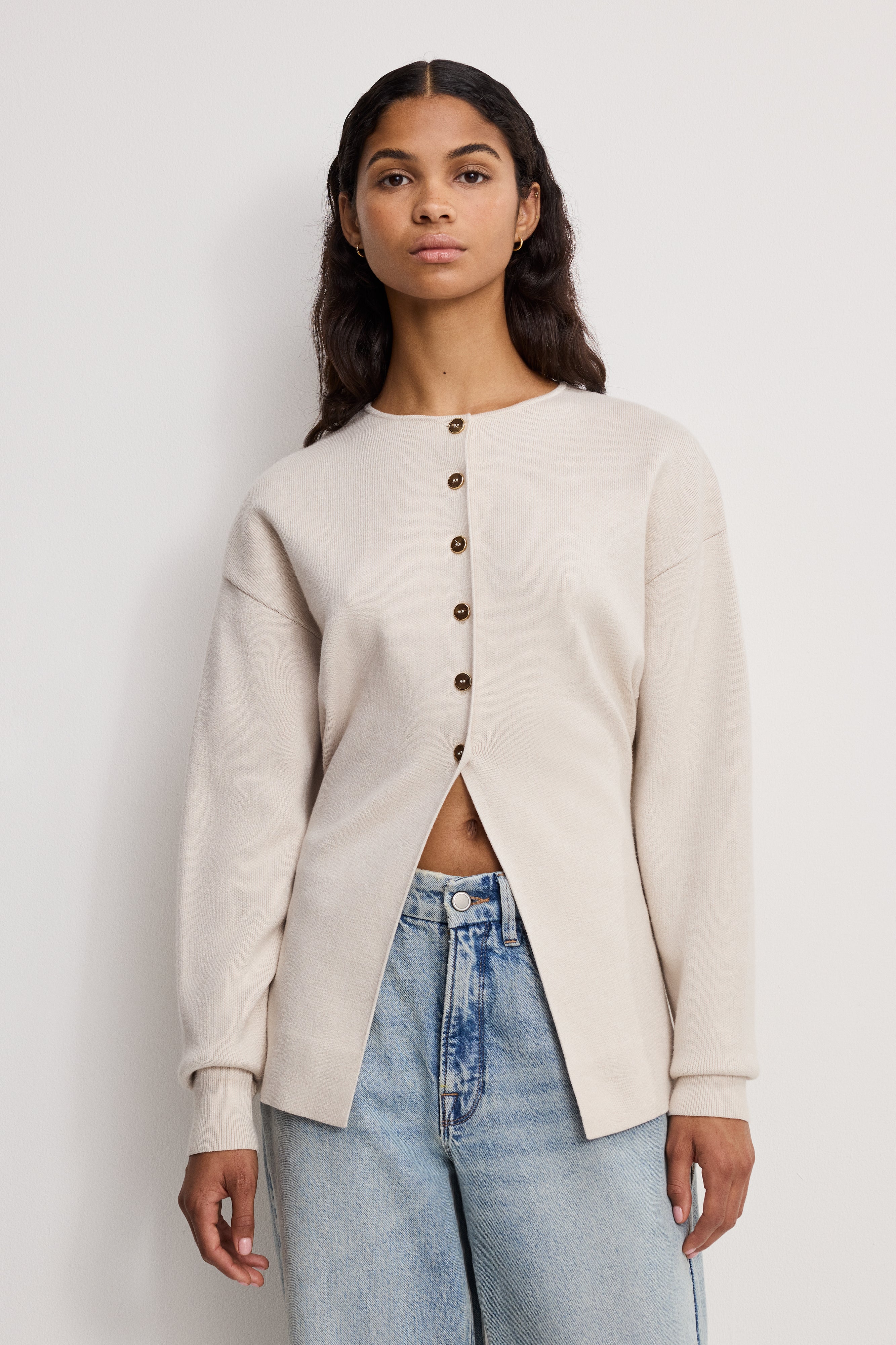 This button-front knit top features a soft, cozy handfeel with a slightly boxy silhouette that drapes just right. Designed with a subtle front slit and classic buttons, it’s an easy layering piece that works buttoned up or styled a little undone.