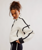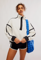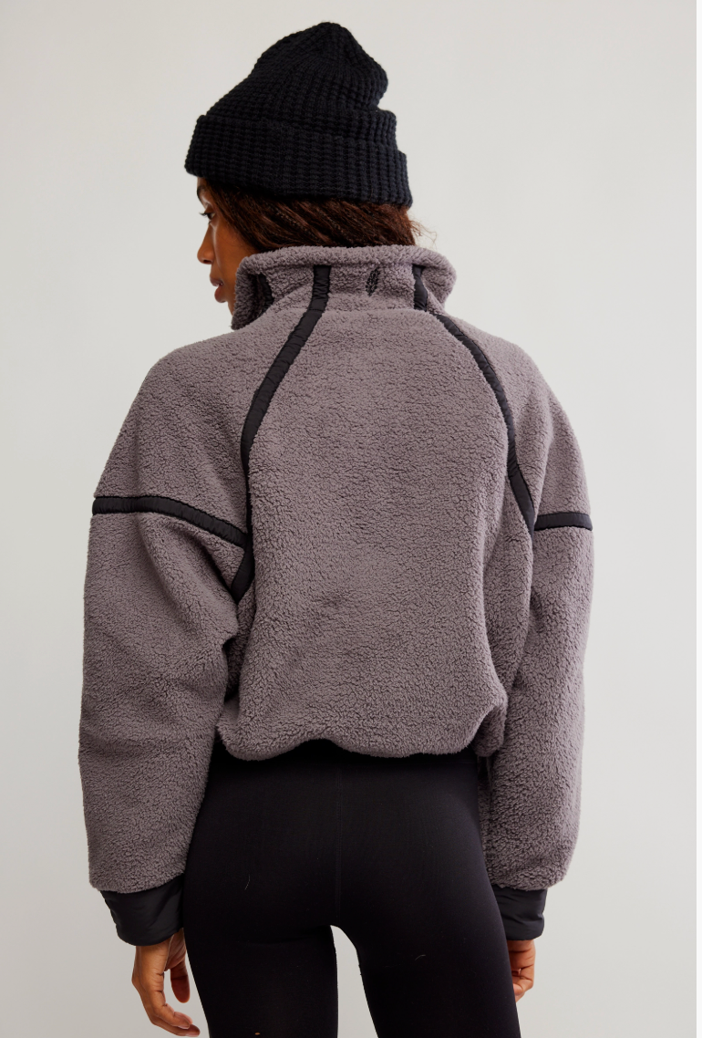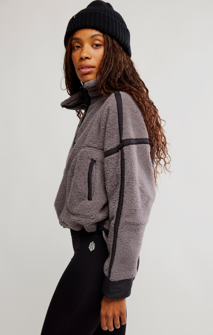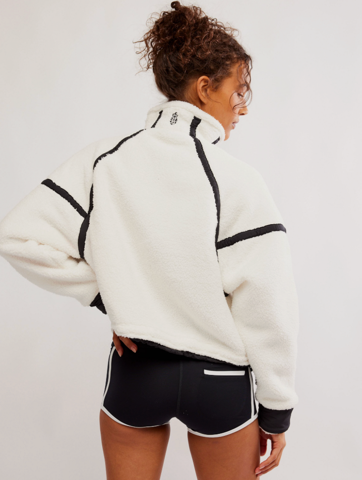 Cozy fleece pullover featuring a half-zip closure and high neckline with bold contrast seams throughout and an adjustable hemline.