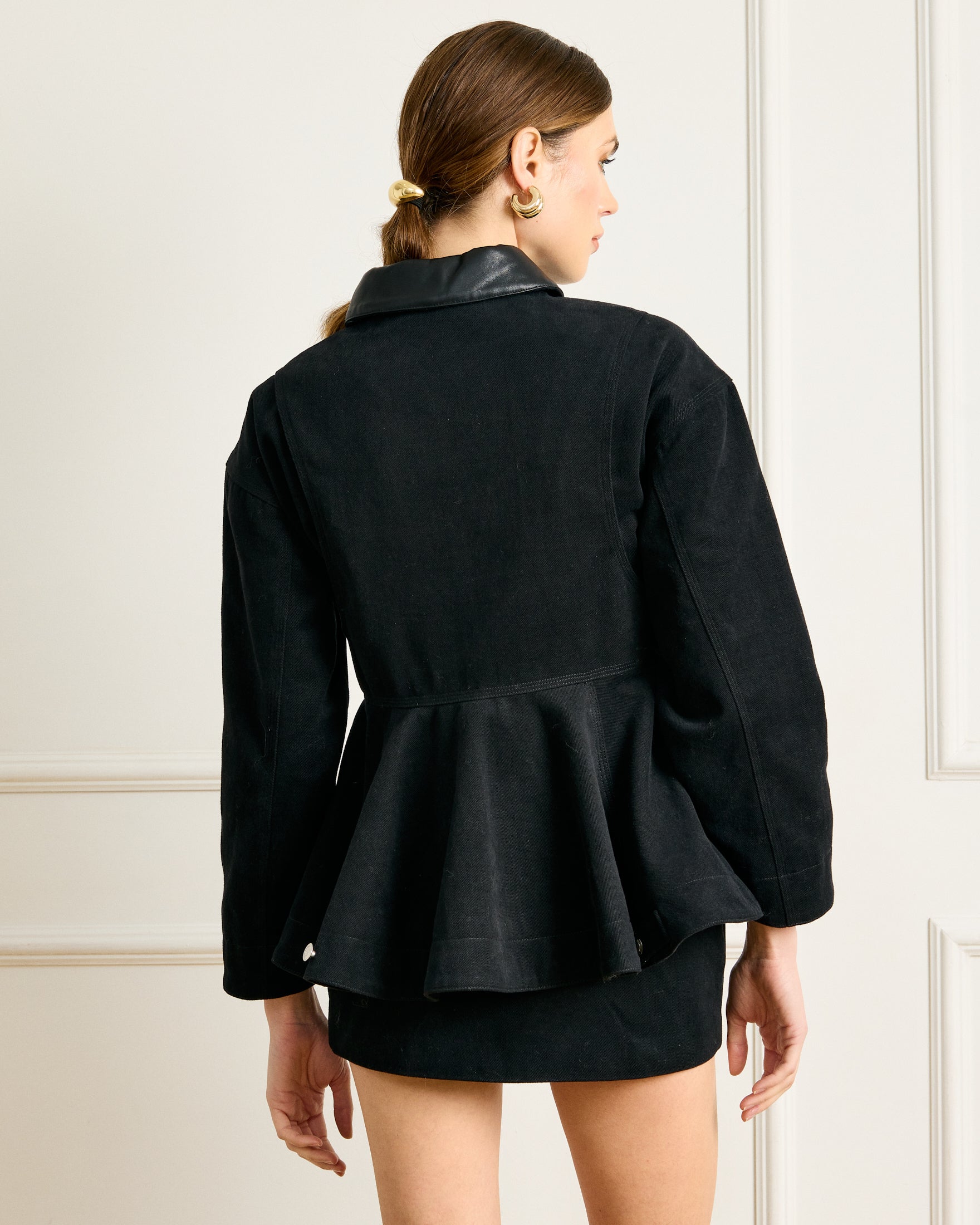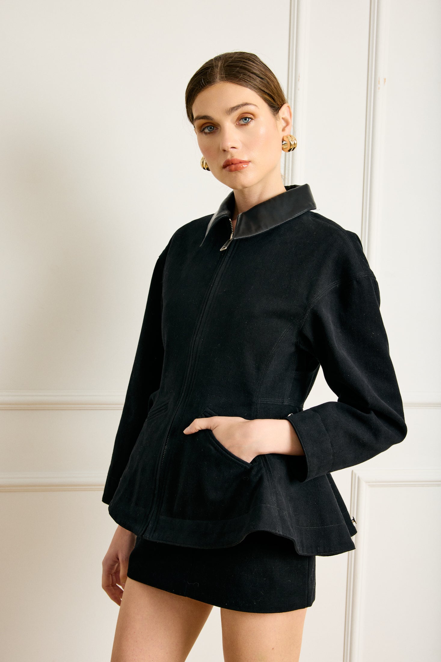 This statement jacket blends modern structure with feminine flair. Crafted in a soft, structured fabric with a subtle suede-like finish, it features a sleek front zip, wide collar, and a dramatic peplum hem that creates beautiful movement and shape. The tailored fit through the bodice flares out at the waist for a flattering silhouette that instantly elevates any look.