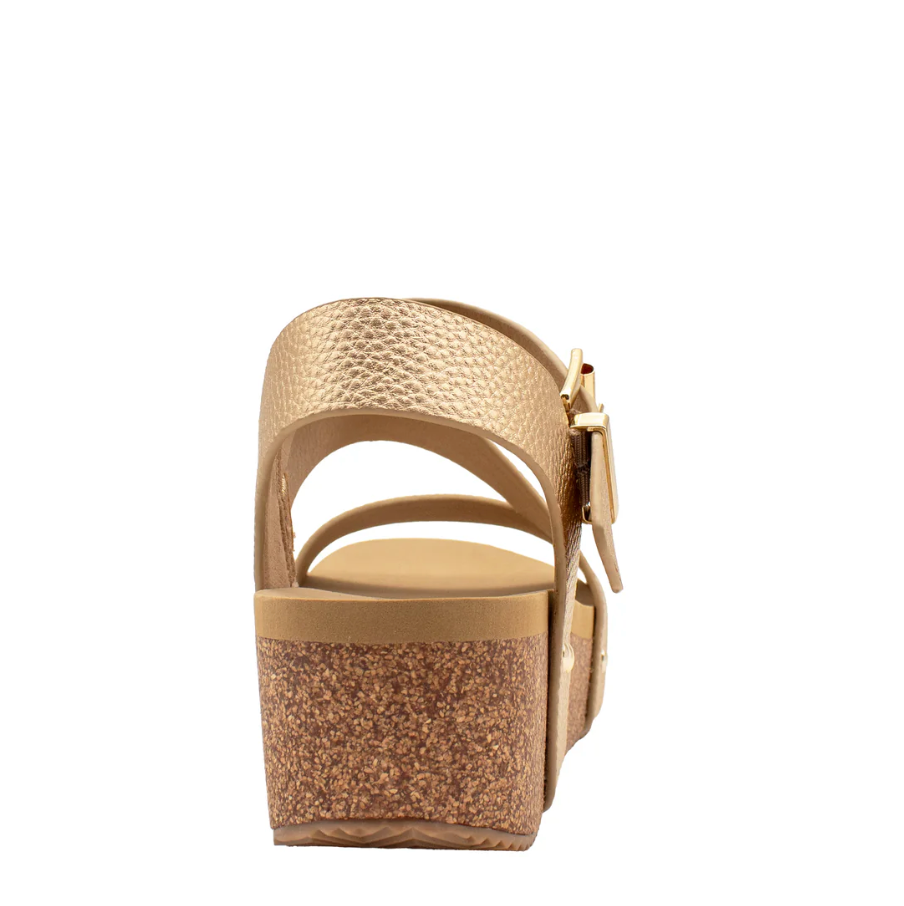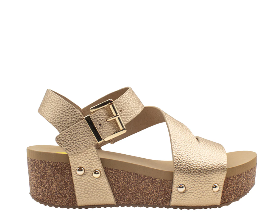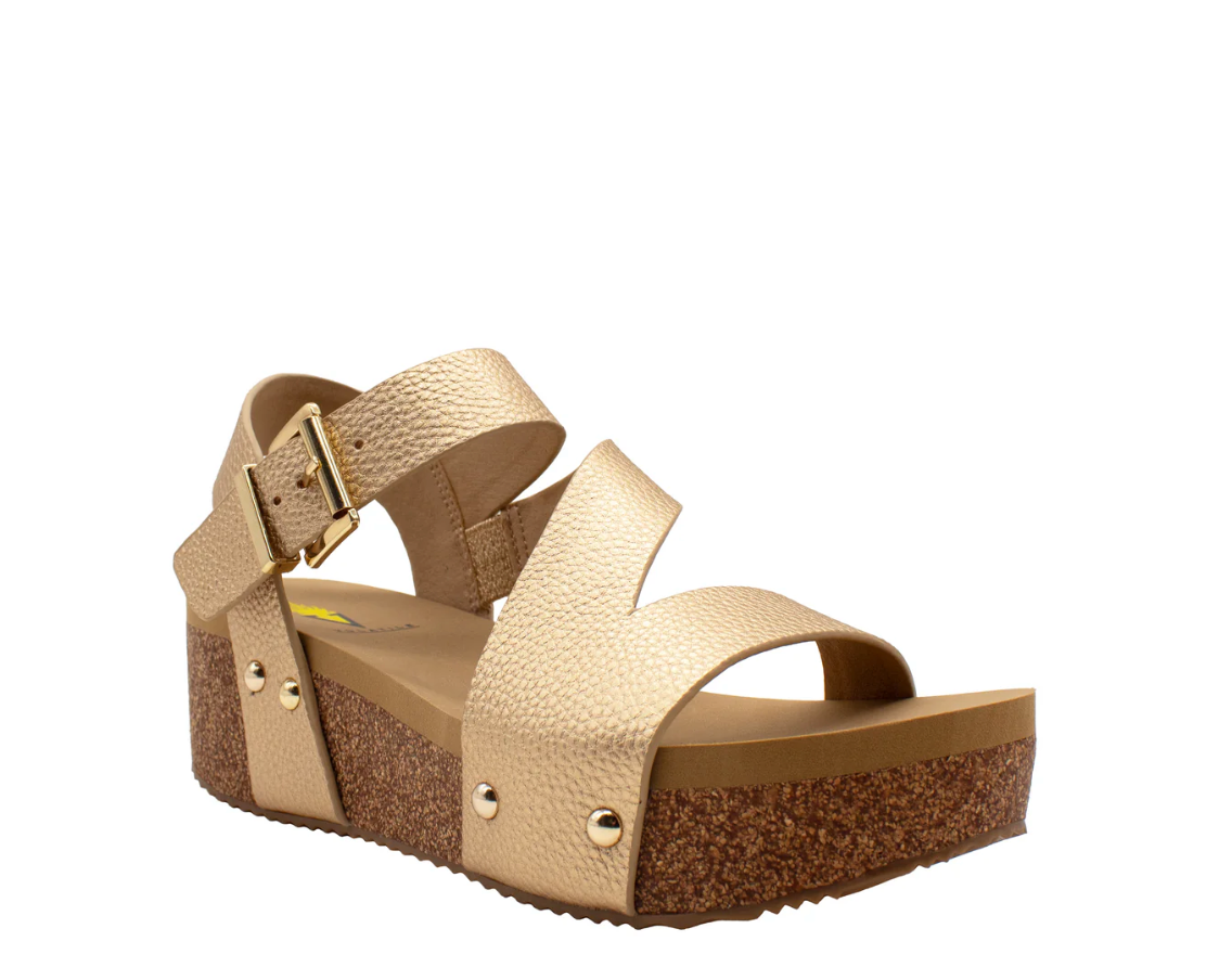 Volatile’s Biloxi gives a modern feel with its asymmetrical upper in vegan leather and attractive metal adjustable buckle and clog stud accents. Featuring our signature ultra comfort EVA insole resting atop a moderate 2” cork wedge with rubber traction outsole for stability. Perfect with maxi dresses and boyfriend jeans alike.
