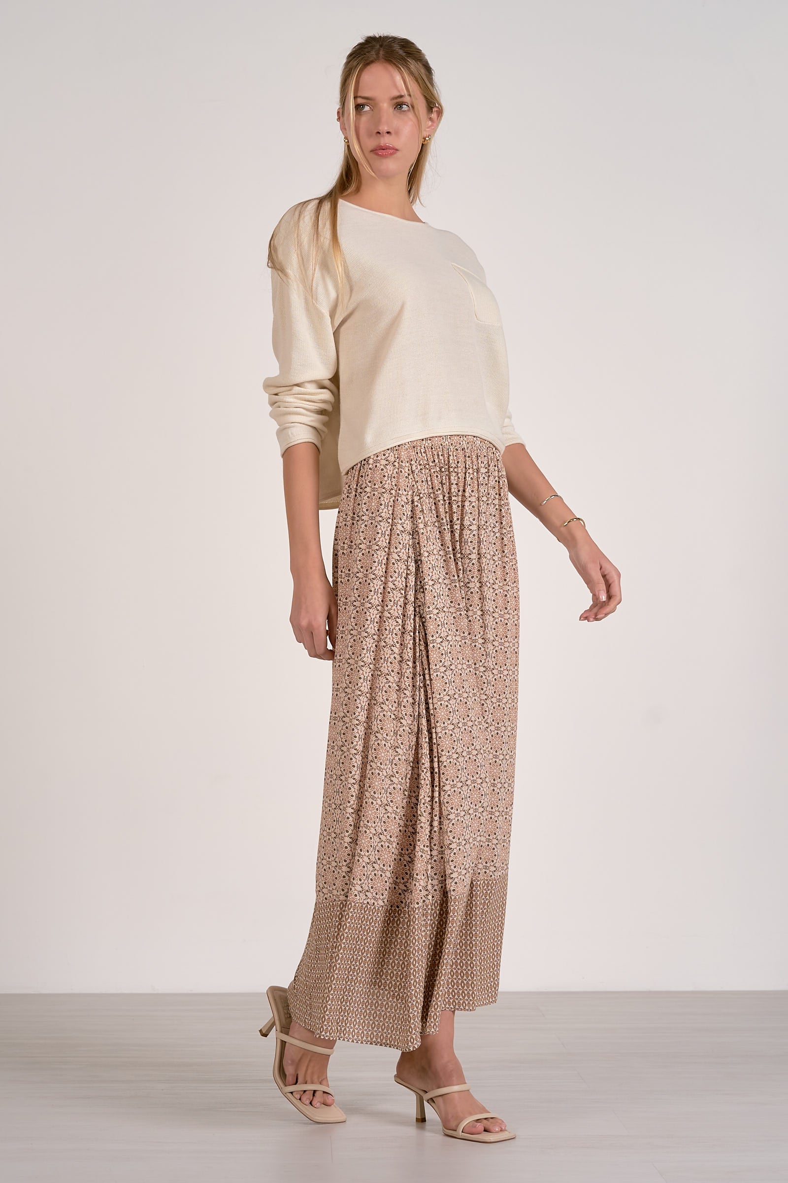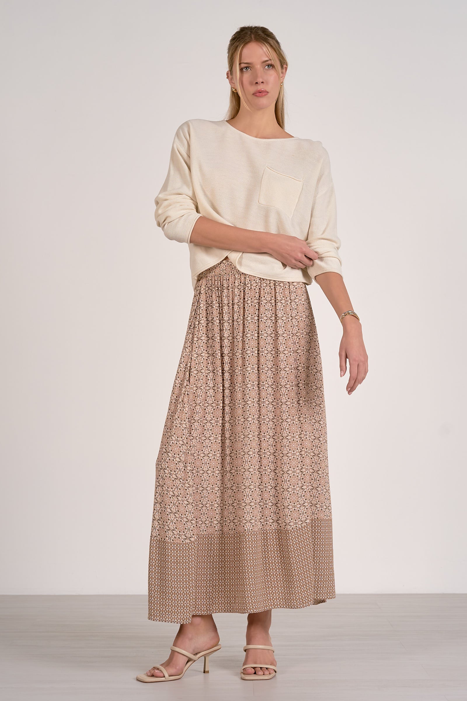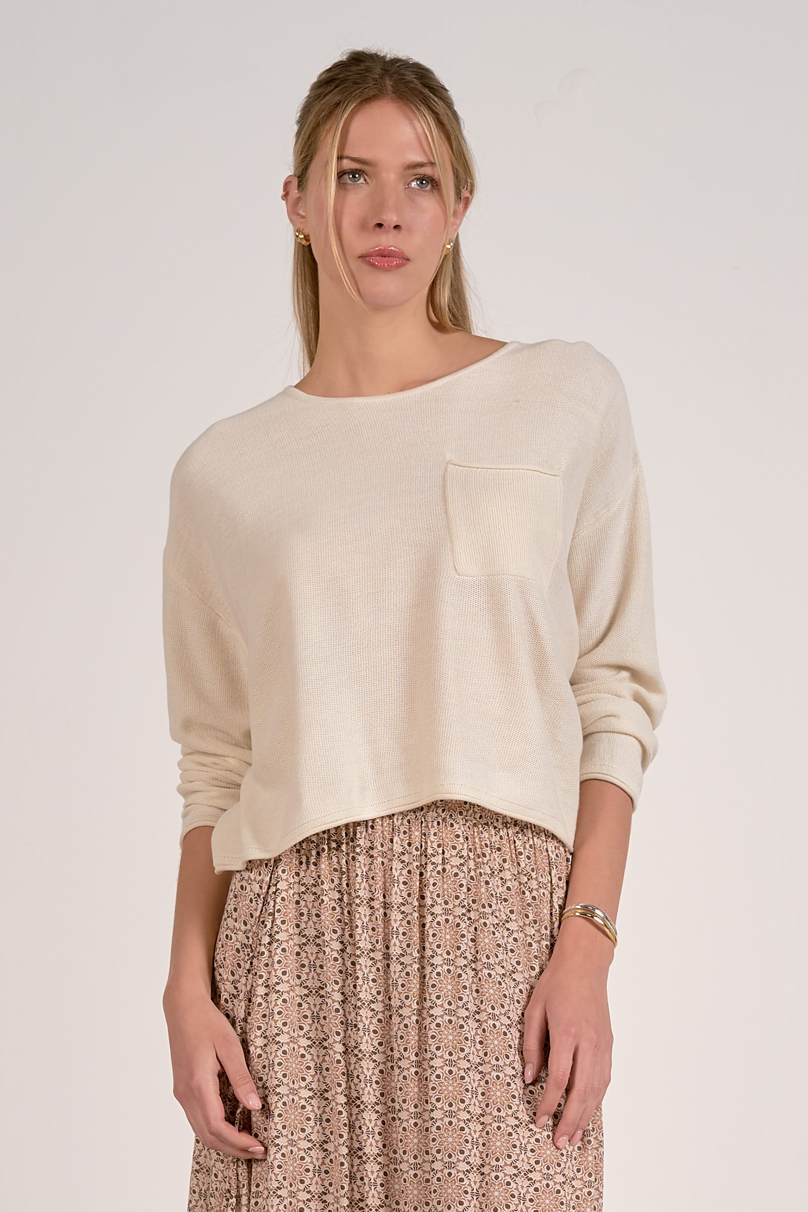 This lightweight knit top features a relaxed silhouette, subtle drop shoulders, and a front chest pocket for a laid-back feel. The easy fit makes it perfect for layering or wearing on its own, pairing effortlessly with denim, skirts, or casual trousers for an elevated everyday look.