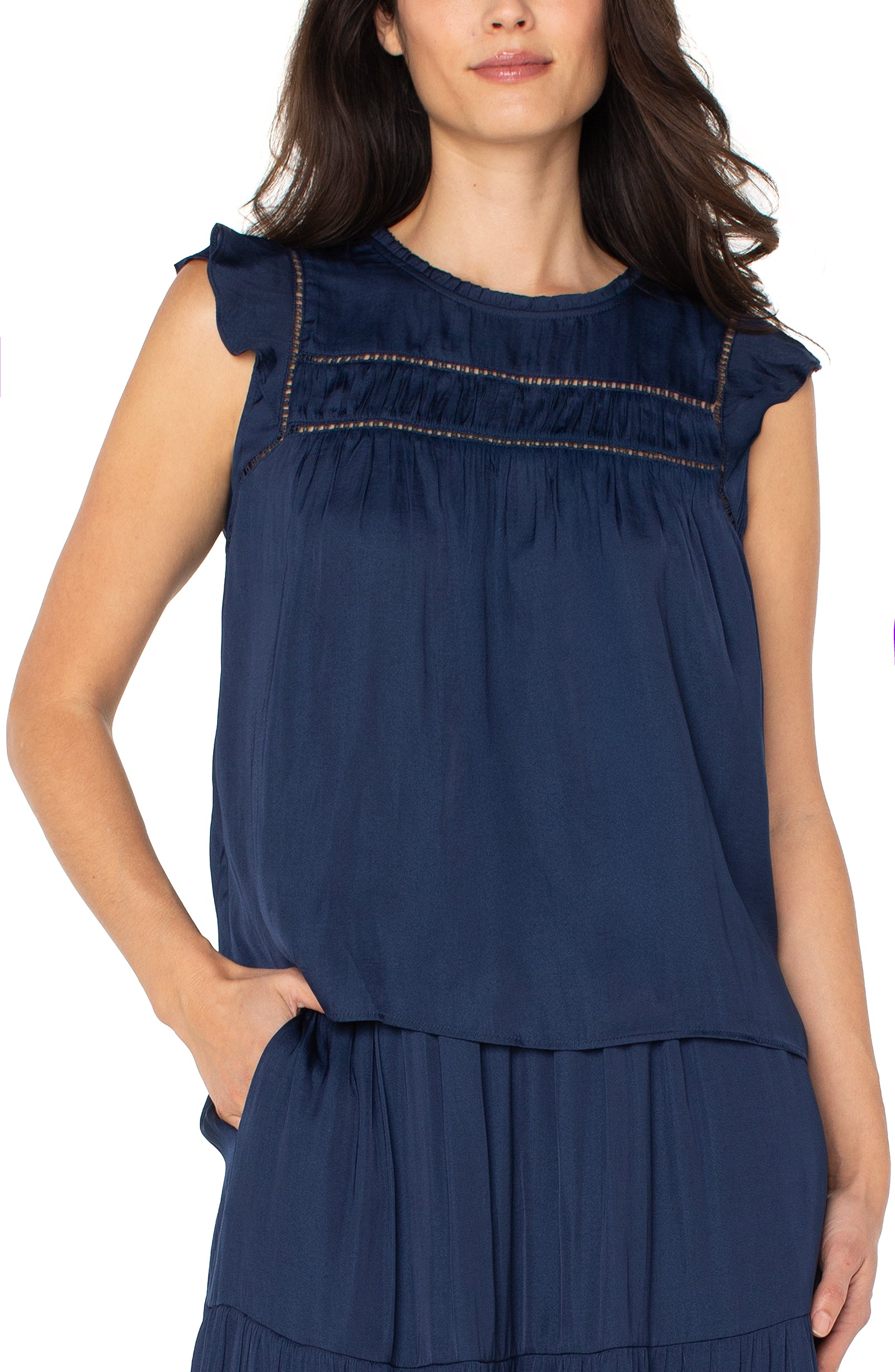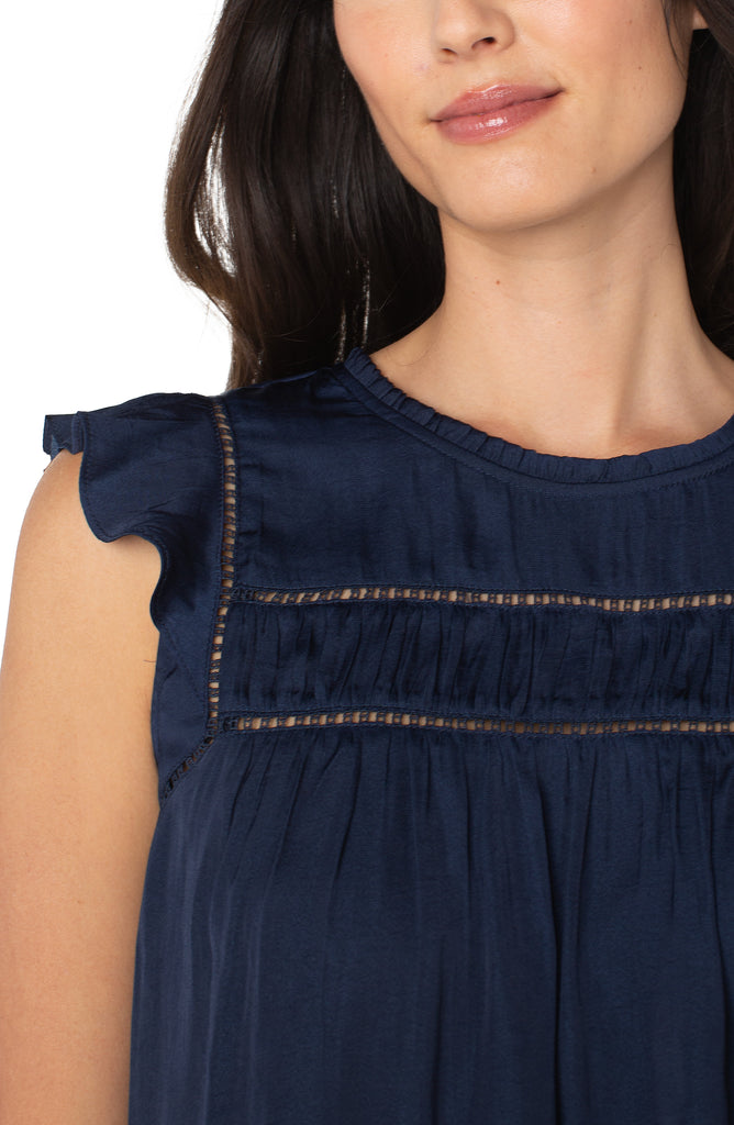 Effortlessly feminine and easy to wear, this navy top features delicate pintuck detailing and airy ruffle sleeves for a touch of charm. Designed in a flowy silhouette, it drapes beautifully and offers all-day comfort. The subtle ladder lace trim adds texture and an elevated finish, making it perfect for both casual days and dressed-up occasions.