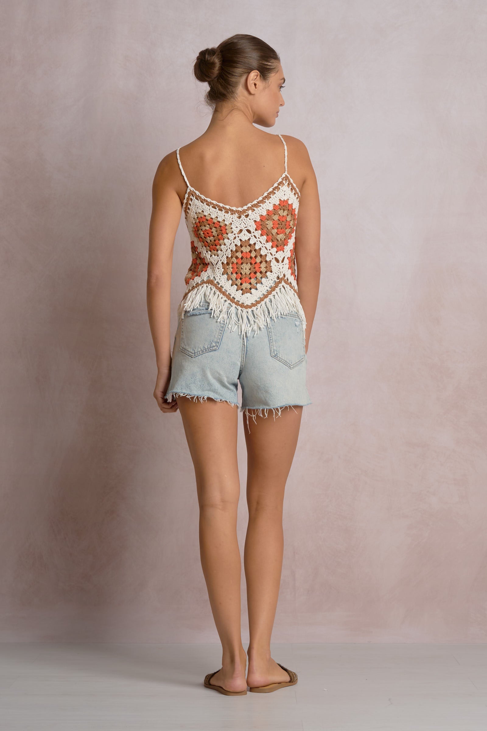 An effortless warm-weather staple with major vacation energy. This crochet cami features a geometric open-knit design, adjustable spaghetti straps, and a flattering V neckline. The fringe hem adds the perfect touch of movement and texture, making it easy to dress up or down.