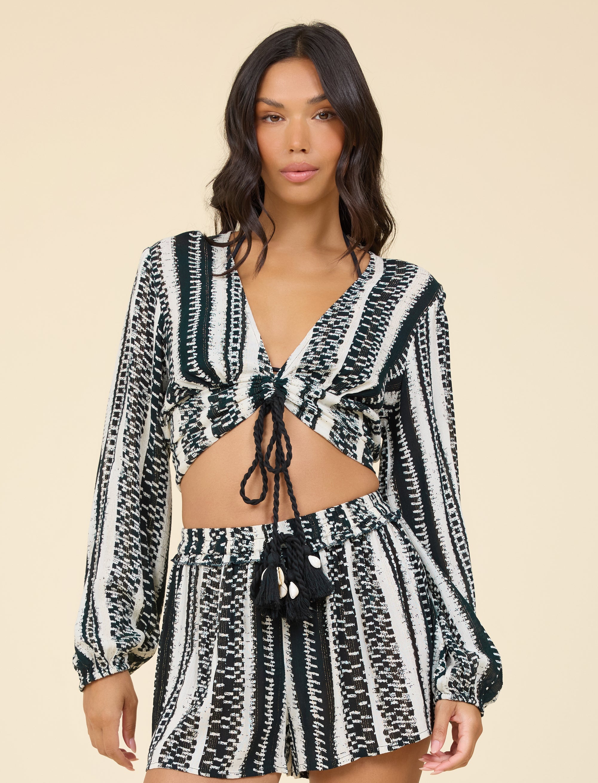 This black-and-white stripe tie-front crop top is made for sun-soaked days and spontaneous nights out. Featuring a deep v-neckline, flowy long sleeves, and adjustable tassel ties, it gives you that effortless “cool girl on vacation” vibe. The lightweight fabric drapes beautifully while the cropped silhouette keeps it flattering and modern.