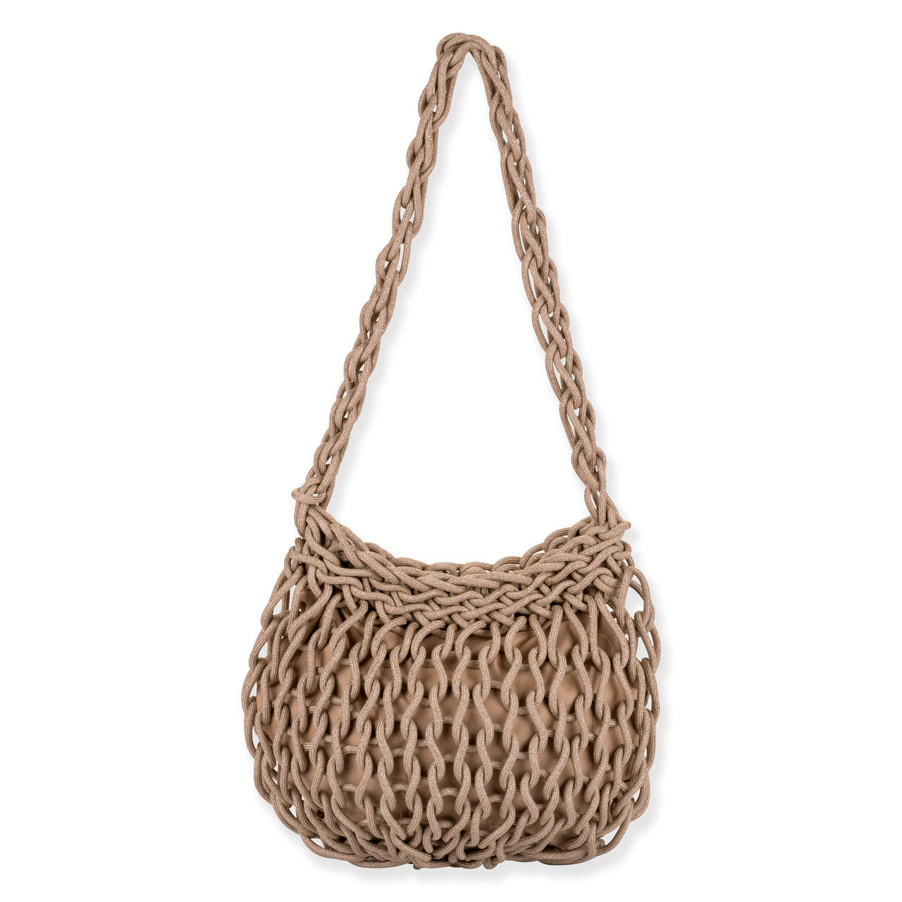 This woven net shoulder bag features a rich, textured rope design with a soft inner pouch for added structure and function. The braided strap and dimensional weave give it that effortless, coastal-meets-city vibe.