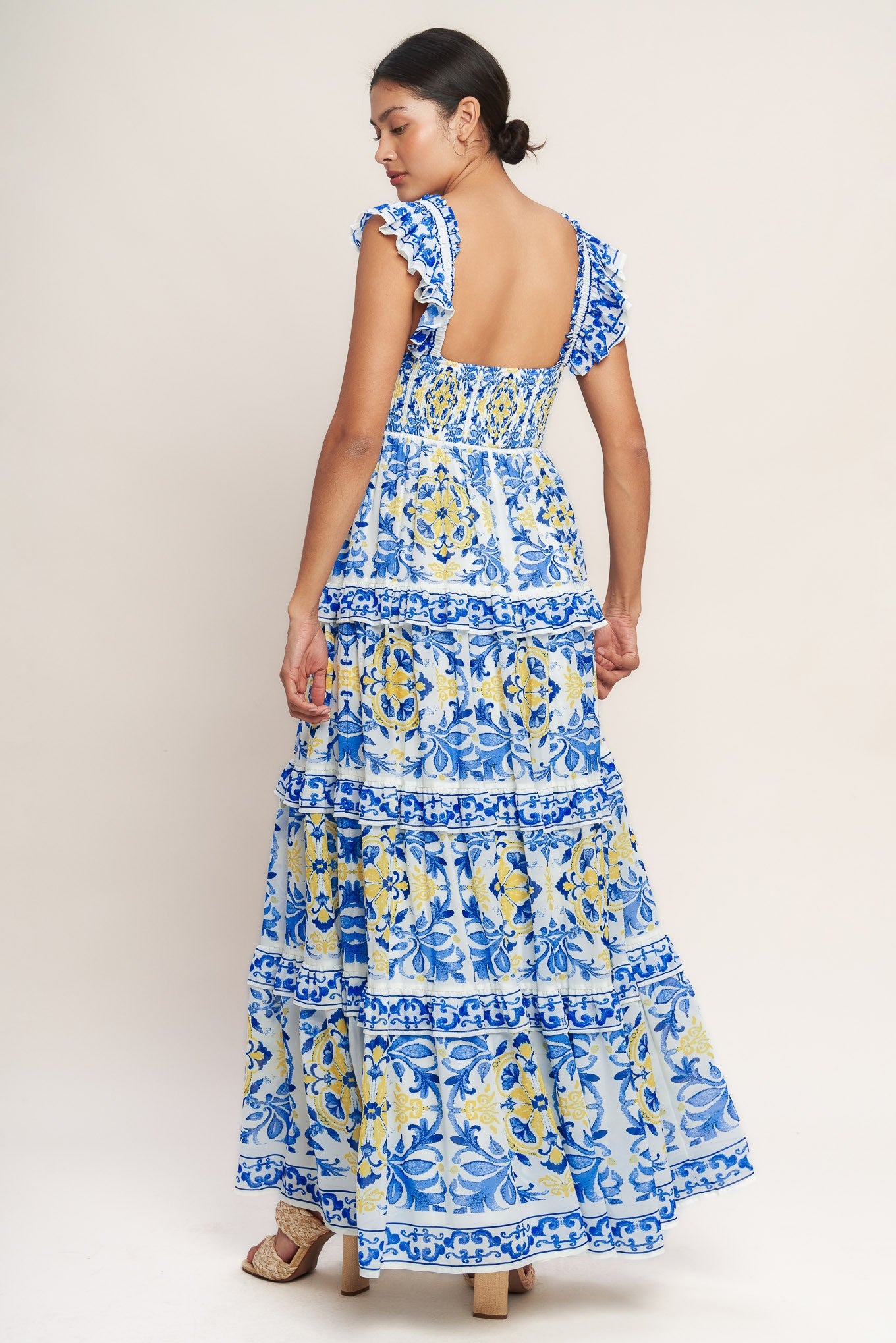 A tiered maxi dress featuring ruffled shoulder straps, a square neckline, and a flattering fitted bodice with a flowy skirt. Designed with a statement print and feminine silhouette, this dress is perfect for vacation, summer events, casual outings, and elevated warm-weather styling.