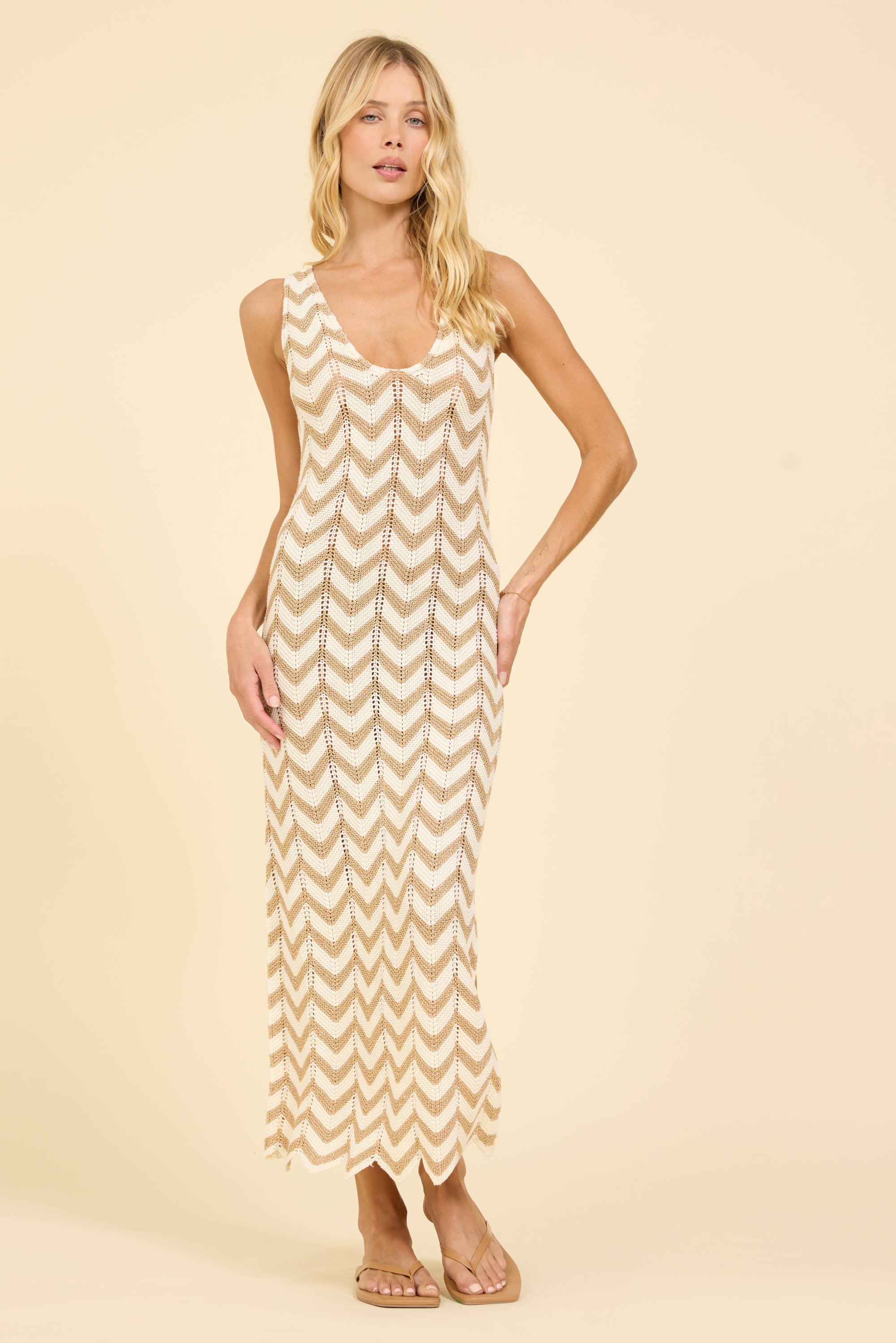 Effortless, breezy, and perfect for warm days. This sleeveless knit maxi dress features a flattering scoop neckline and a lightweight chevron pattern that creates beautiful movement and texture. The relaxed silhouette makes it easy to wear from beach days to summer dinners.