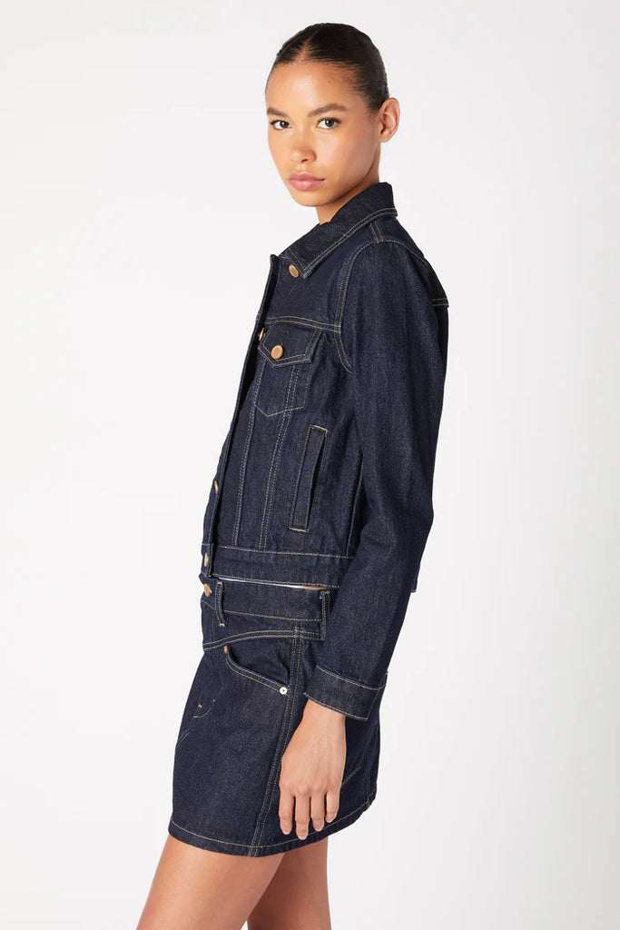 This classic denim jacket is crafted from premium dark-wash denim with clean lines and a flattering, structured fit. Finished with gold-tone buttons and contrast stitching, it’s the ultimate year-round staple — perfect for layering over tees, dresses, or knits. Effortlessly cool, endlessly wearable.