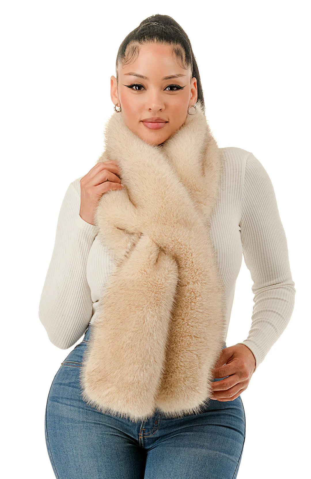 This luxe faux fur scarf adds instant polish to any cold-weather look. Designed to feel soft and plush against the skin, it drapes effortlessly for a chic, elevated finish. Whether layered over a sweater or worn with outerwear, this scarf brings warmth and style together in one standout accessory.