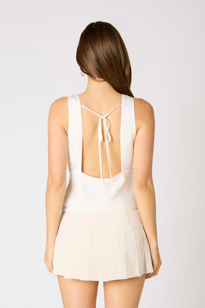Clean, modern, and effortlessly chic—this white satin top features a deep V neckline, layered hem, and an open back with a delicate tie detail. Perfect for dressing up your denim or pairing with a flirty mini for summer nights out.
