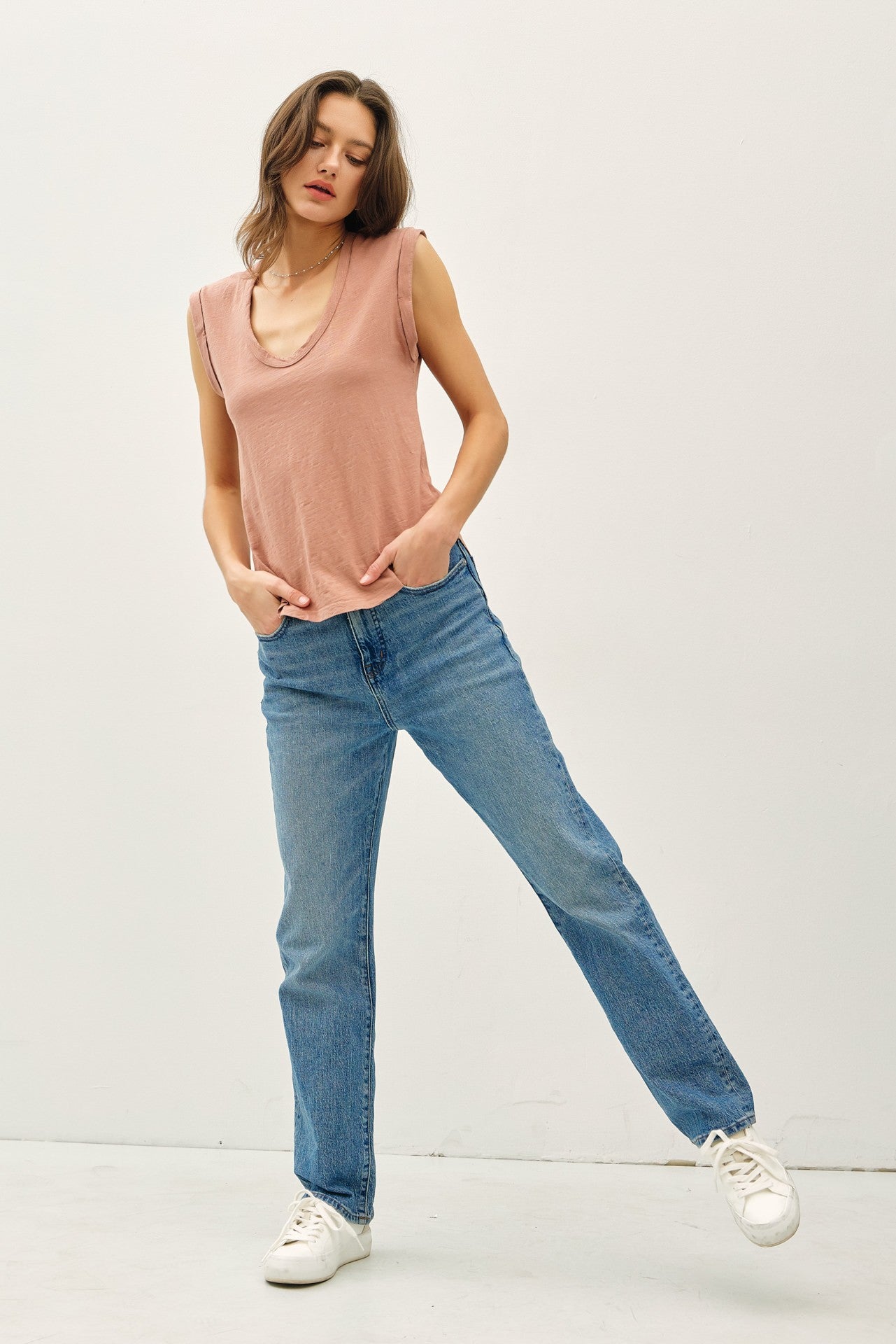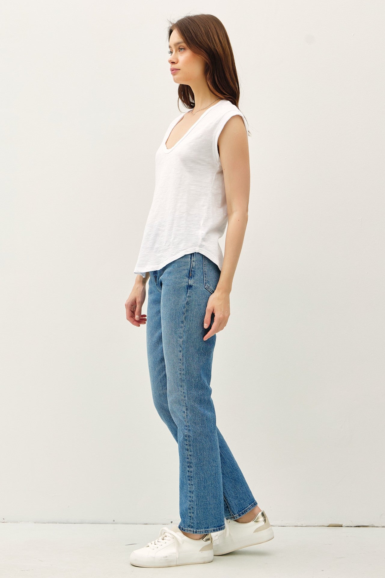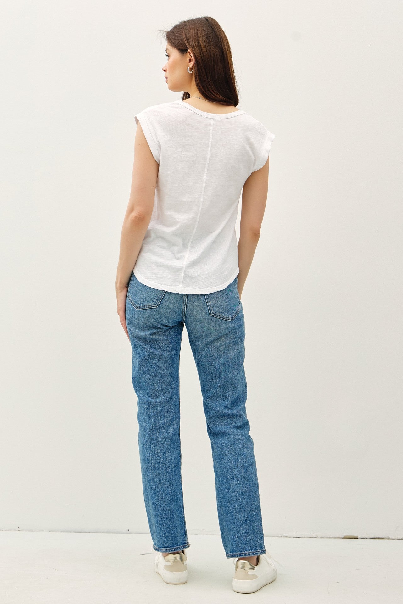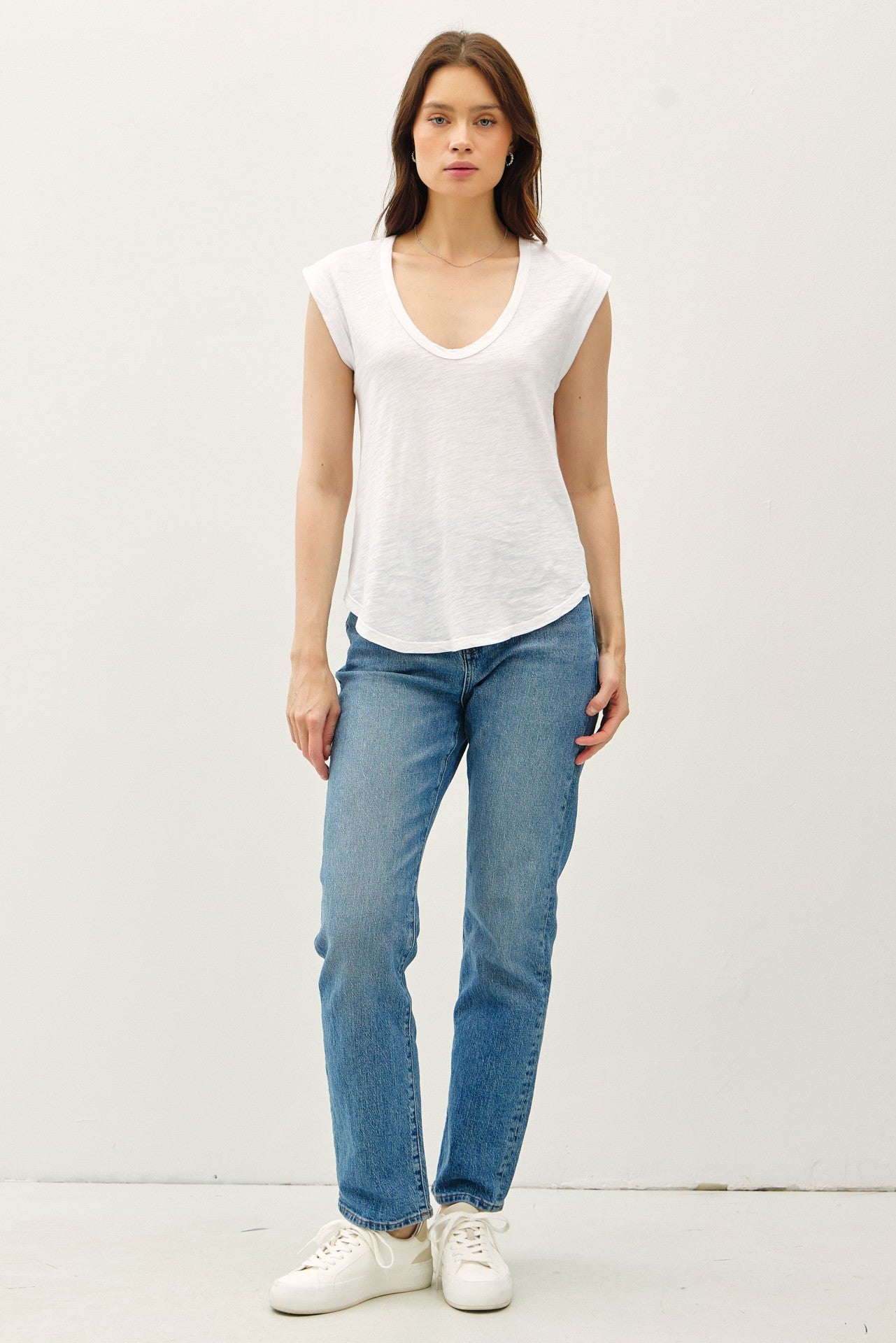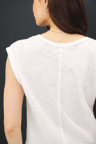 A wardrobe essential, this Scoop Neck Cap Sleeve Top will become your go-to for essential. Crafted from comfortable cotton slub fabric, it features a relaxed fit, folded cap sleeves, and a round hem with a center back seam detail. Fabric Details: