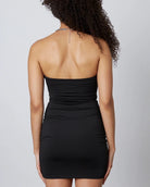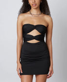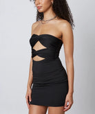 This strapless twist front dress features a body hugging silhouette with two small cut out details, perfect for a night out this summer!