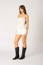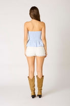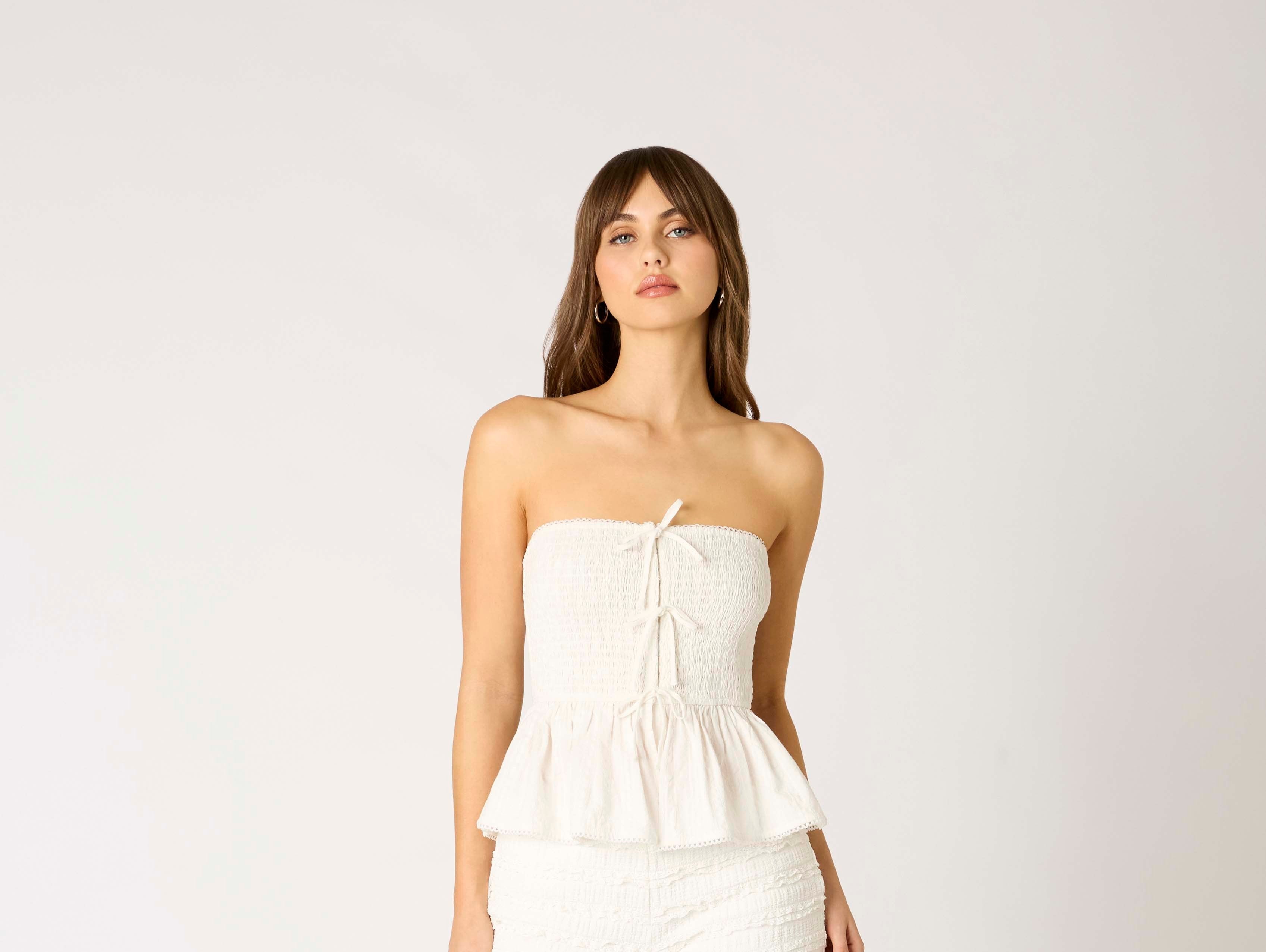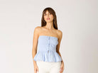 This chambray strapless top features a smocked bodice, tie-front detail, and flouncy peplum hem for a flattering, feminine fit. Easy, breezy, and perfect for warm days—just add shorts and boots for that effortless country-cute vibe.