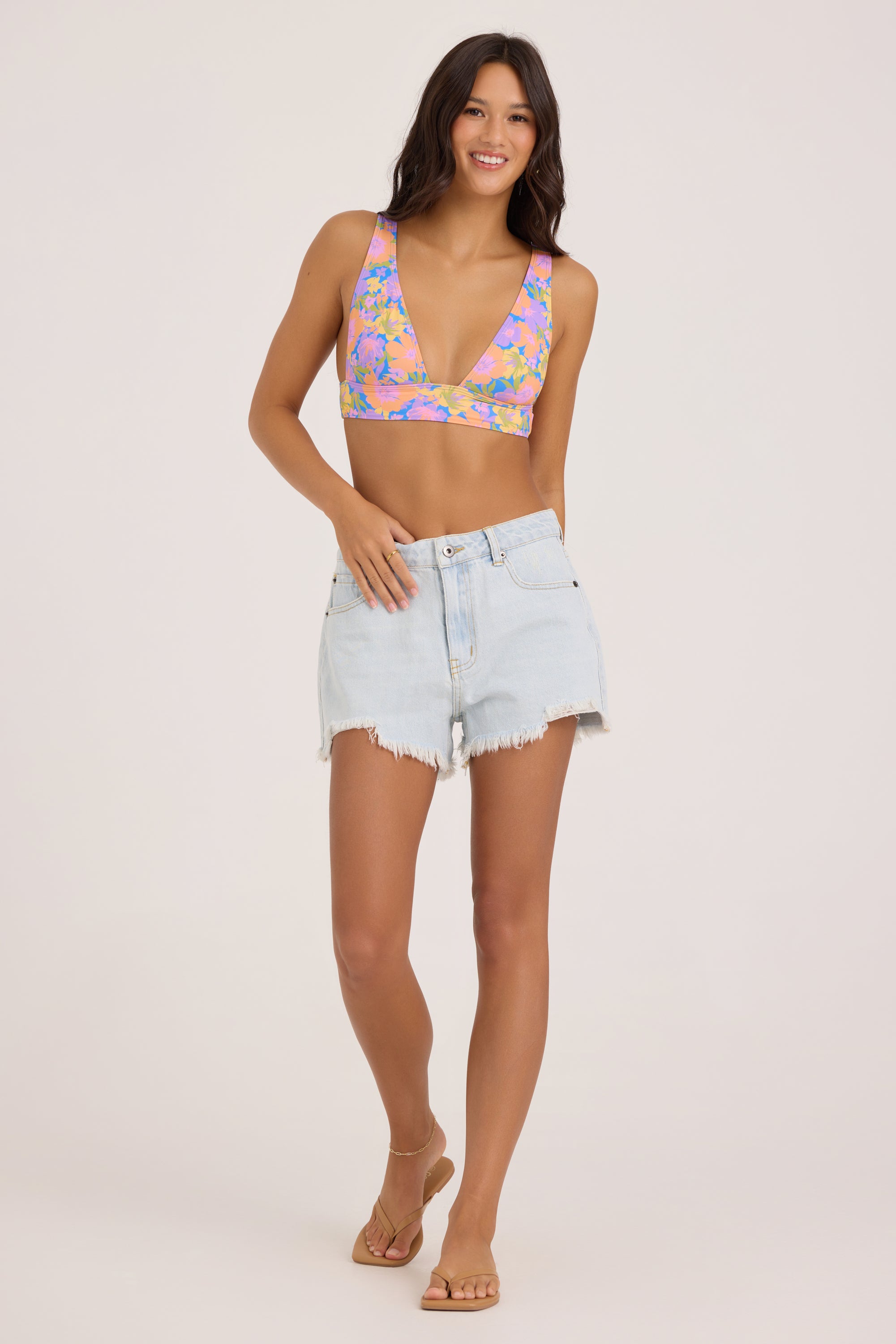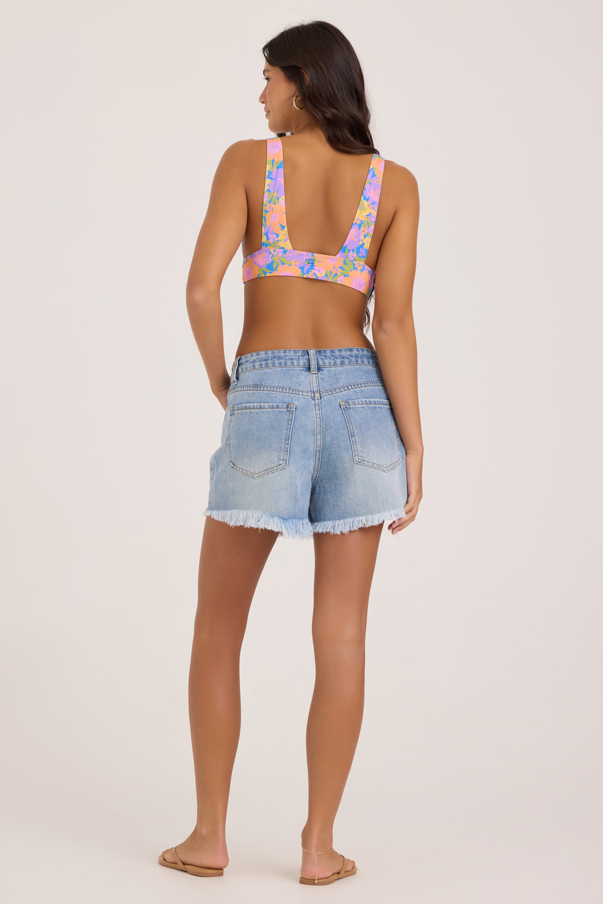 These high rise jean shorts feature a flattering fit with a frayed hem and subtle distressing for an effortless, worn-in look. Designed for everyday comfort, they offer easy styling for warm weather and casual outings. Perfect for pairing with tanks, tees, and swim tops, these jean shorts are a go-to staple for beach days, weekends, and vacation wear.
