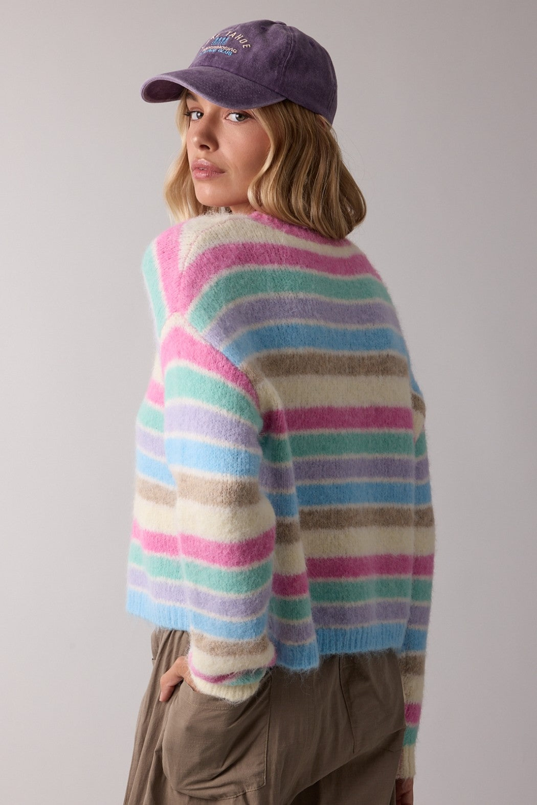 Soft, cozy, and made to brighten your day. This fuzzy knit sweater features cheerful pastel stripes in a relaxed, easy silhouette that feels as good as it looks. Lightweight yet warm, it’s perfect for layering through the seasons. The classic crew neckline and slightly cropped length make it effortless with high-rise denim, trousers, or relaxed lounge bottoms. A feel-good sweater you’ll reach for again and again.