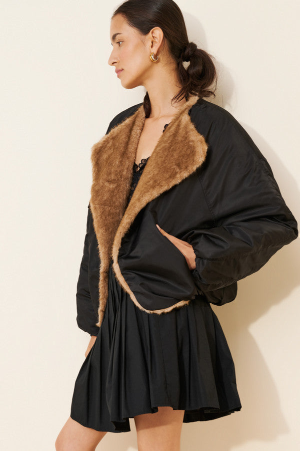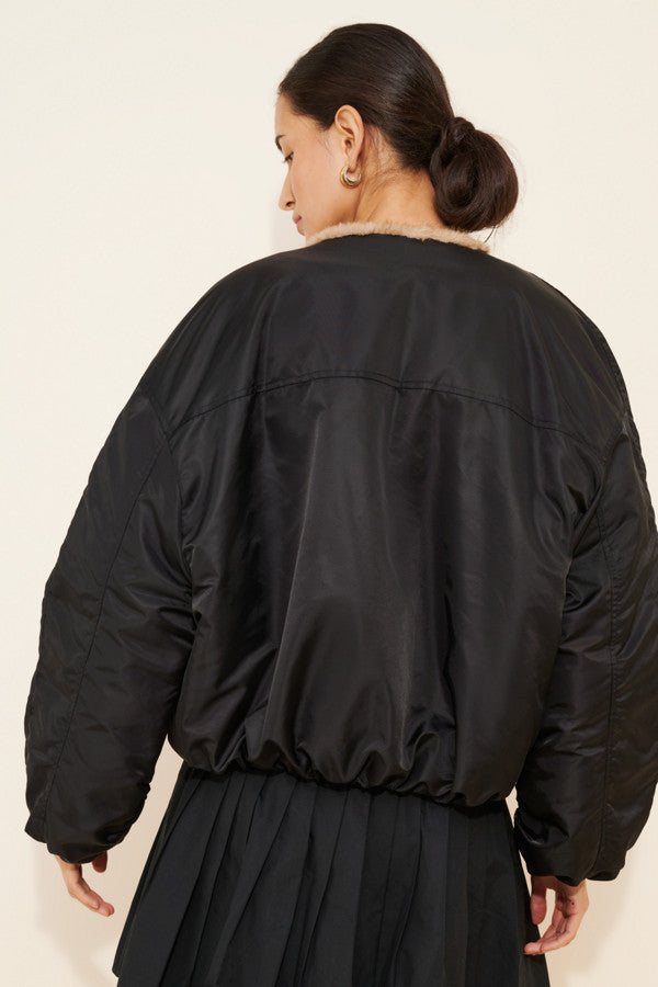 This elevated bomber jacket brings effortless cool with a cozy twist. Designed with a plush faux-fur collar and soft trim, it balances edgy and chic perfectly. The relaxed silhouette layers easily over dresses, knits, or tees, making it a go-to piece for transitional weather and chilly nights. Finished with elastic cuffs and a slightly cropped fit for a modern feel.