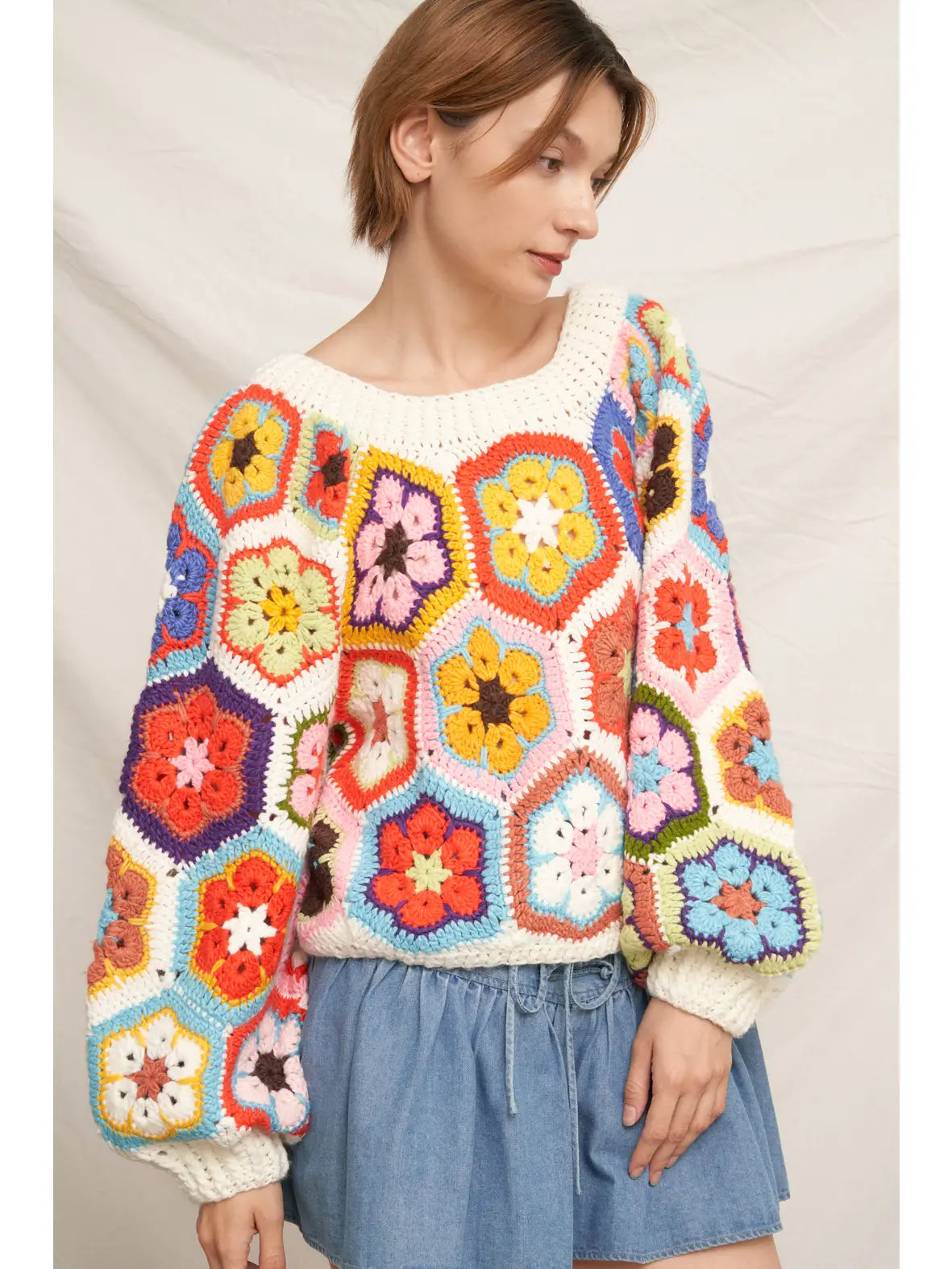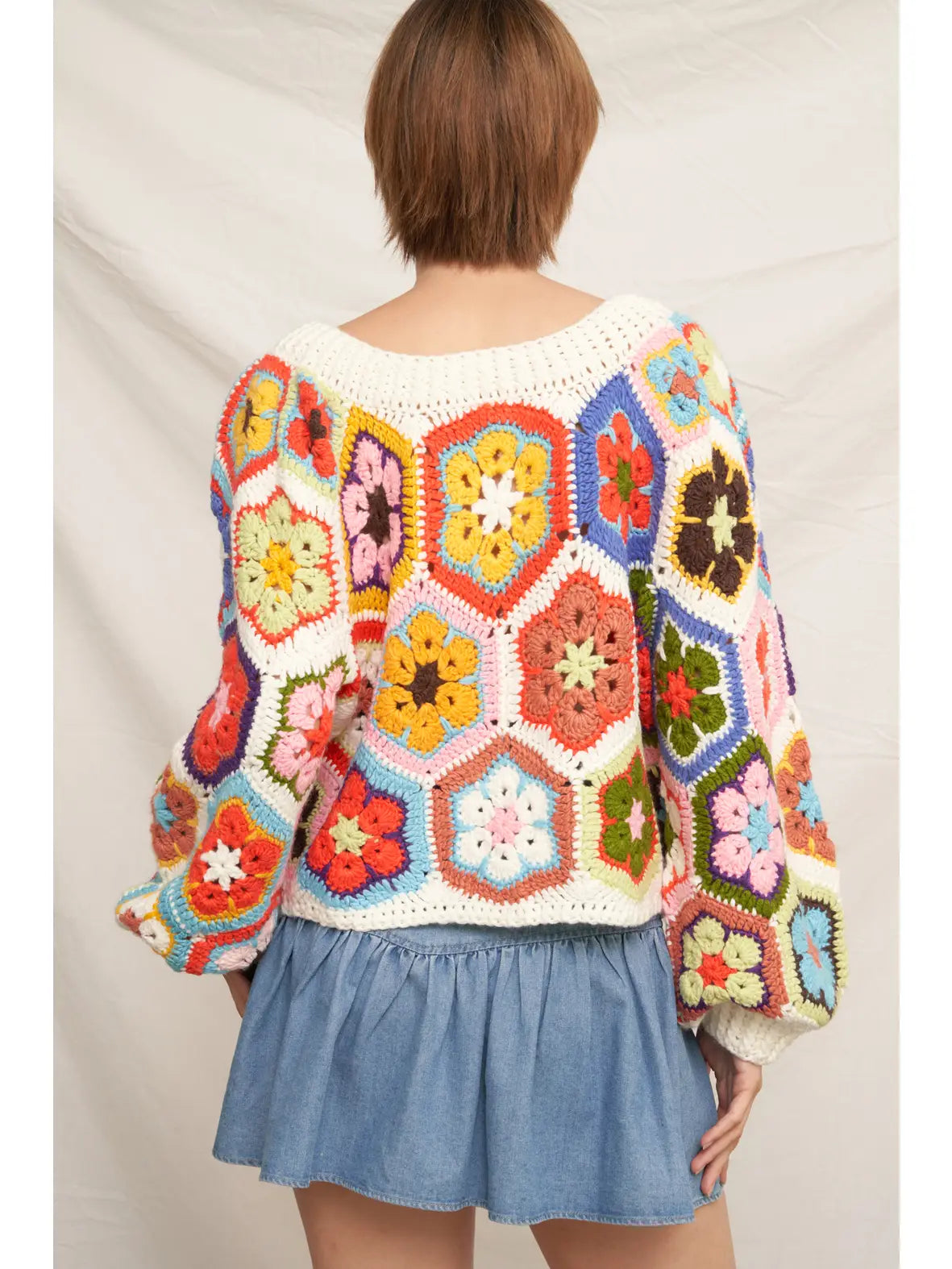 A true statement piece. This hand-crocheted sweater features a vibrant mix of colorful floral granny-square motifs that instantly brighten any outfit. Designed with a relaxed fit, soft knit feel, and slightly cropped length, it’s equal parts cozy and playful. Perfect for adding a pop of color to everyday denim or dressing up your casual looks.