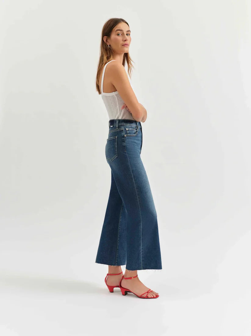 The Pleaser is our tried and true high rise wide ankle, featuring seaming details at the waist against an indigo blue wash with slight fading. This fit is constructed from our Hug denim, which is flexible enough to hug your body, yet heavy enough to cinch you in. FIT: 11 1/2" Rise, 28" Inseam, 19" Leg Opening