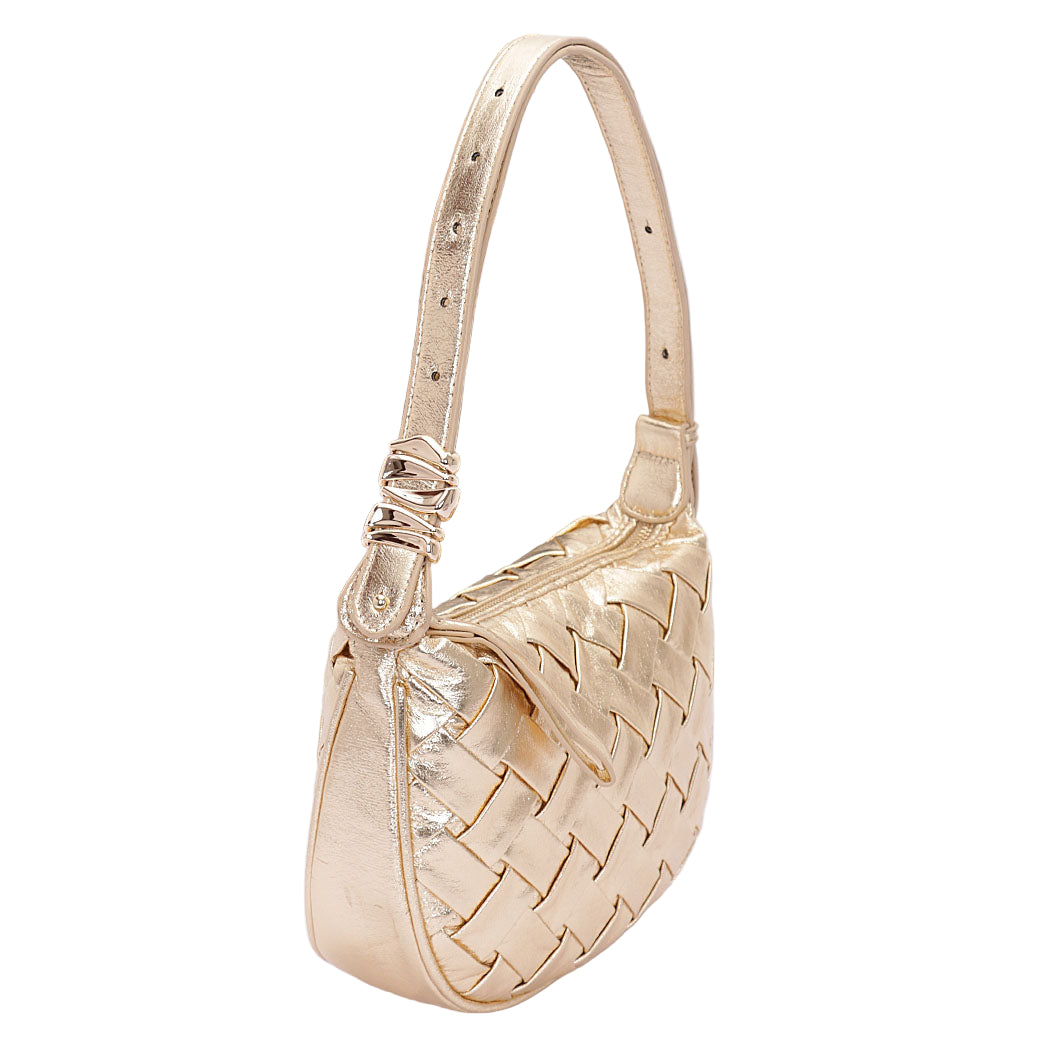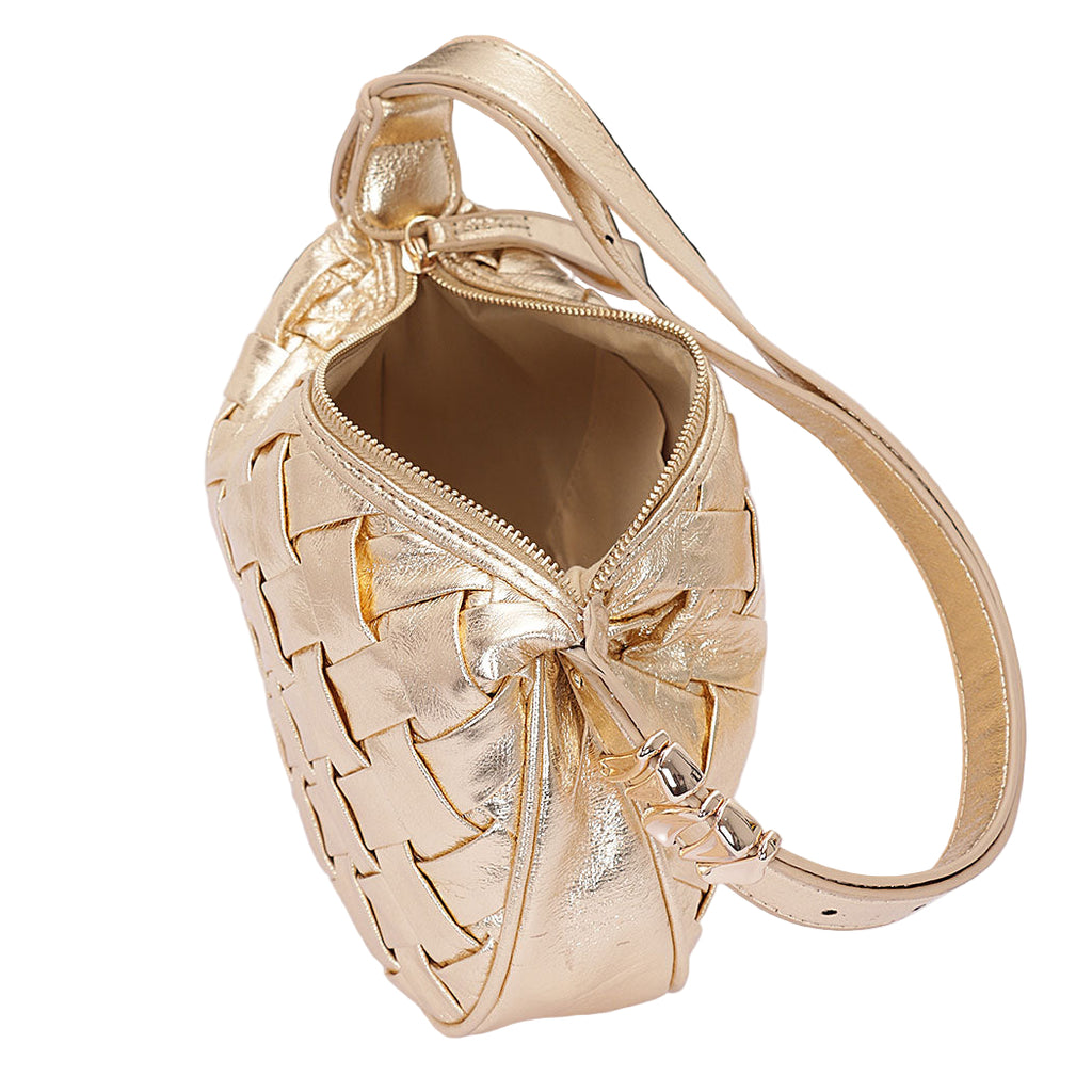 Shimmer and shine with this statement gold woven shoulder bag. The luxe metallic finish and soft braided texture make it the perfect day-to-night piece—effortless with denim and elevated with a mini dress. Features an adjustable strap and zip closure to keep your essentials chicly secured.