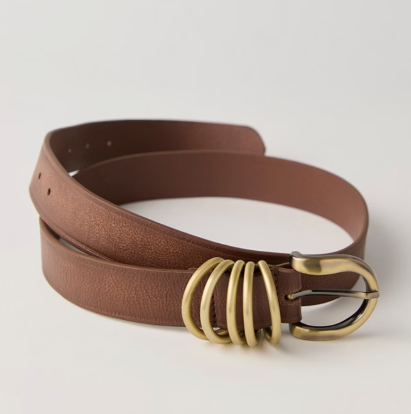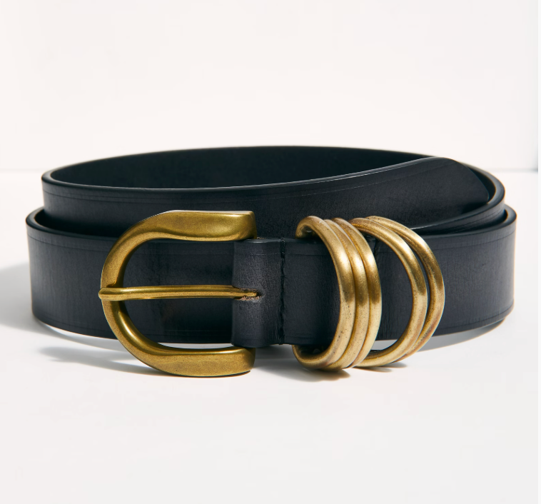 Pull things together in this classic leather belt featuring gold hardware with ring details on the side.