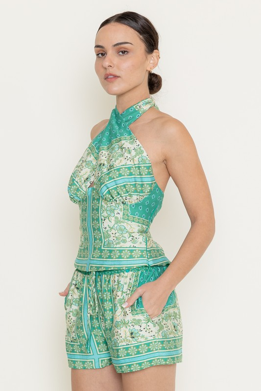 Bold and beautiful, this halter top features a vibrant green floral print with a flattering, fitted bodice and crisscross neckline. Pair it with the matching shorts for a coordinated look or mix it with denim for a fresh, summer vibe.
