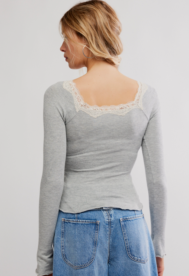 Soft, simple, and subtly romantic. This fitted long sleeve top features a delicate lace-trimmed square neckline that adds just the right touch of femininity. The stretchy ribbed knit hugs the body for a flattering, comfortable fit — perfect for layering under blazers, denim jackets, or wearing on its own for an effortless everyday look.